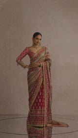 Kashida inspired saree with aari and zardozi embroidery on hand painted artwork further accentuated with sequins kundan and crystals is paired with a complenting blouse