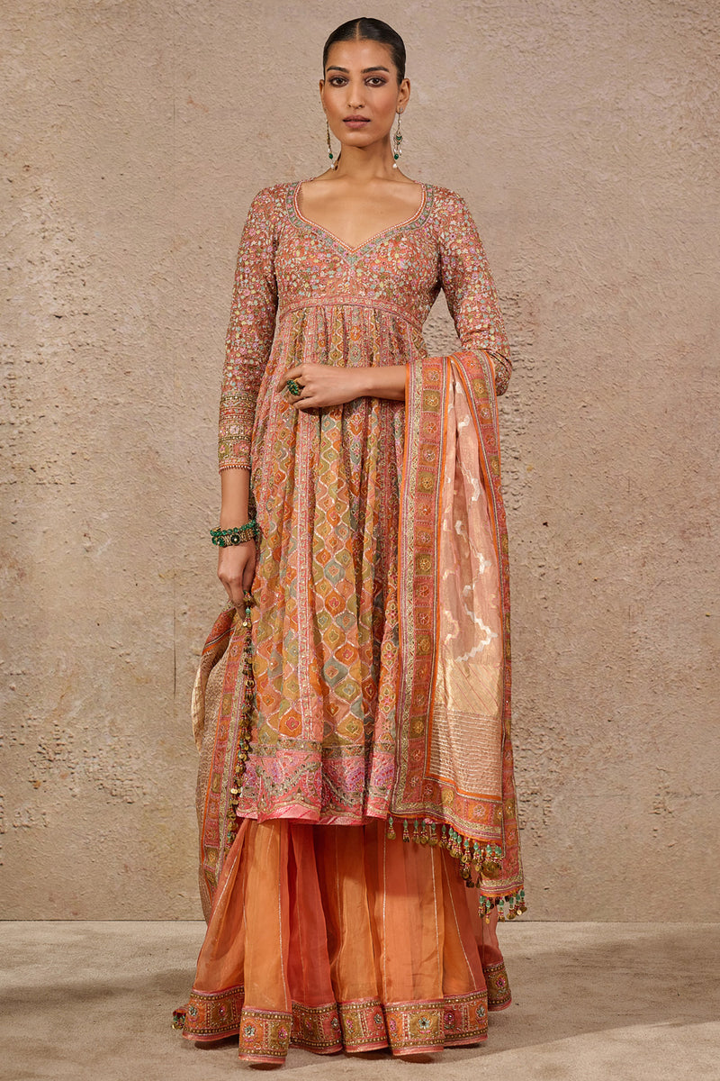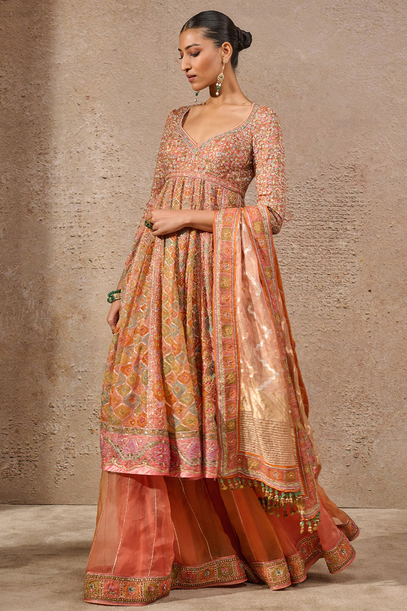 Aari embroidered kalidar kurta highlighted with crystal, sequin, pearl and bead embellishments, paired with a hand-embroidered sharara and textile dupatta