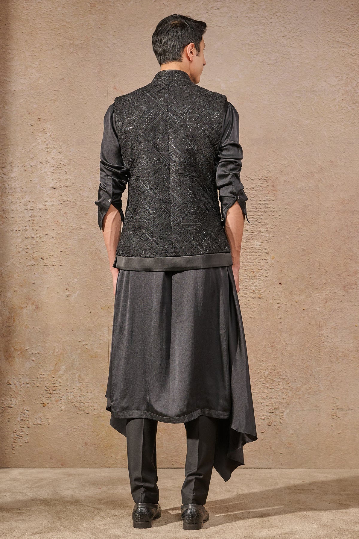 Structured waistcoat featuring abstract geometric embroidery in tonal resham threads accented with sequins, paired with a kurta and trouser