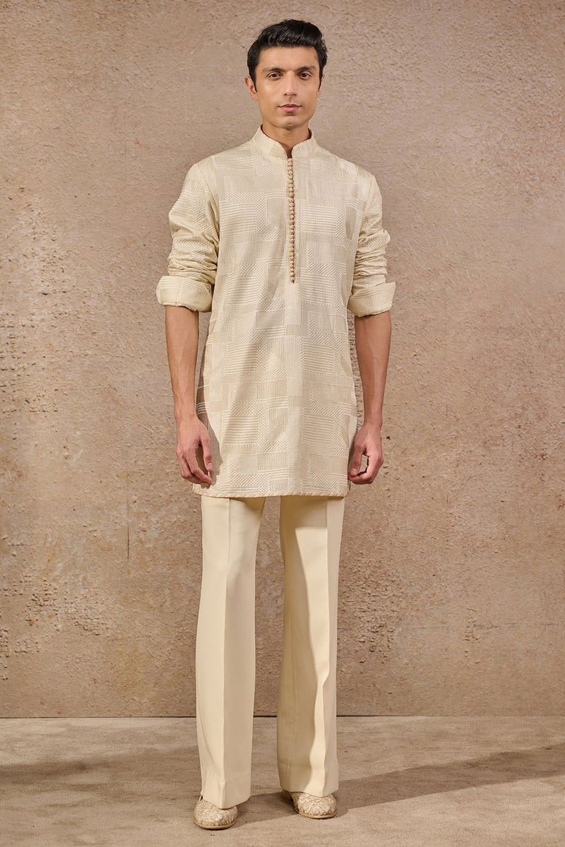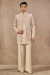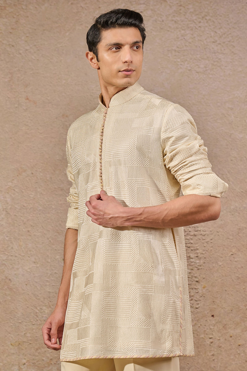 Classic bandhgala with abstract line motifs embroidered in multi-coloured resham threads, highlighted with pearls, paired with a textured short kurta and trousers