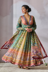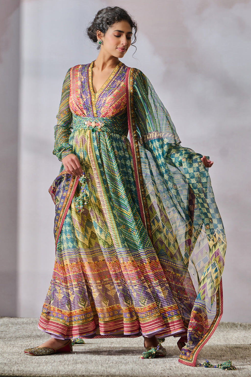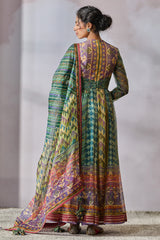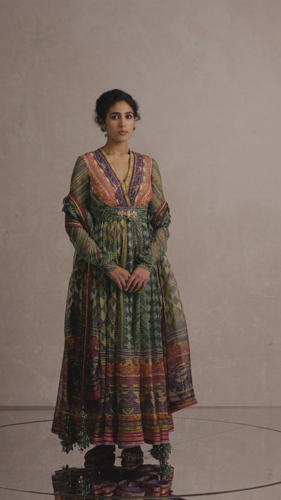 Phulkari inspired printed anarkali accentuated with a jewel brooch, paired with