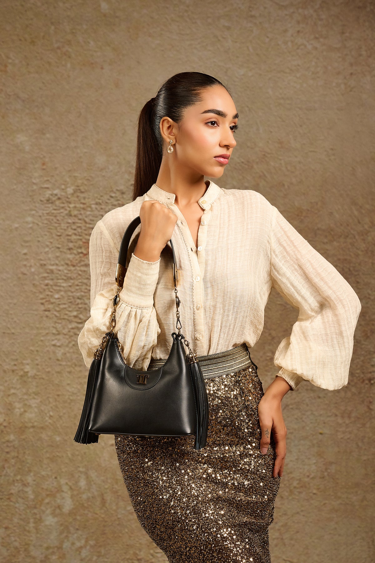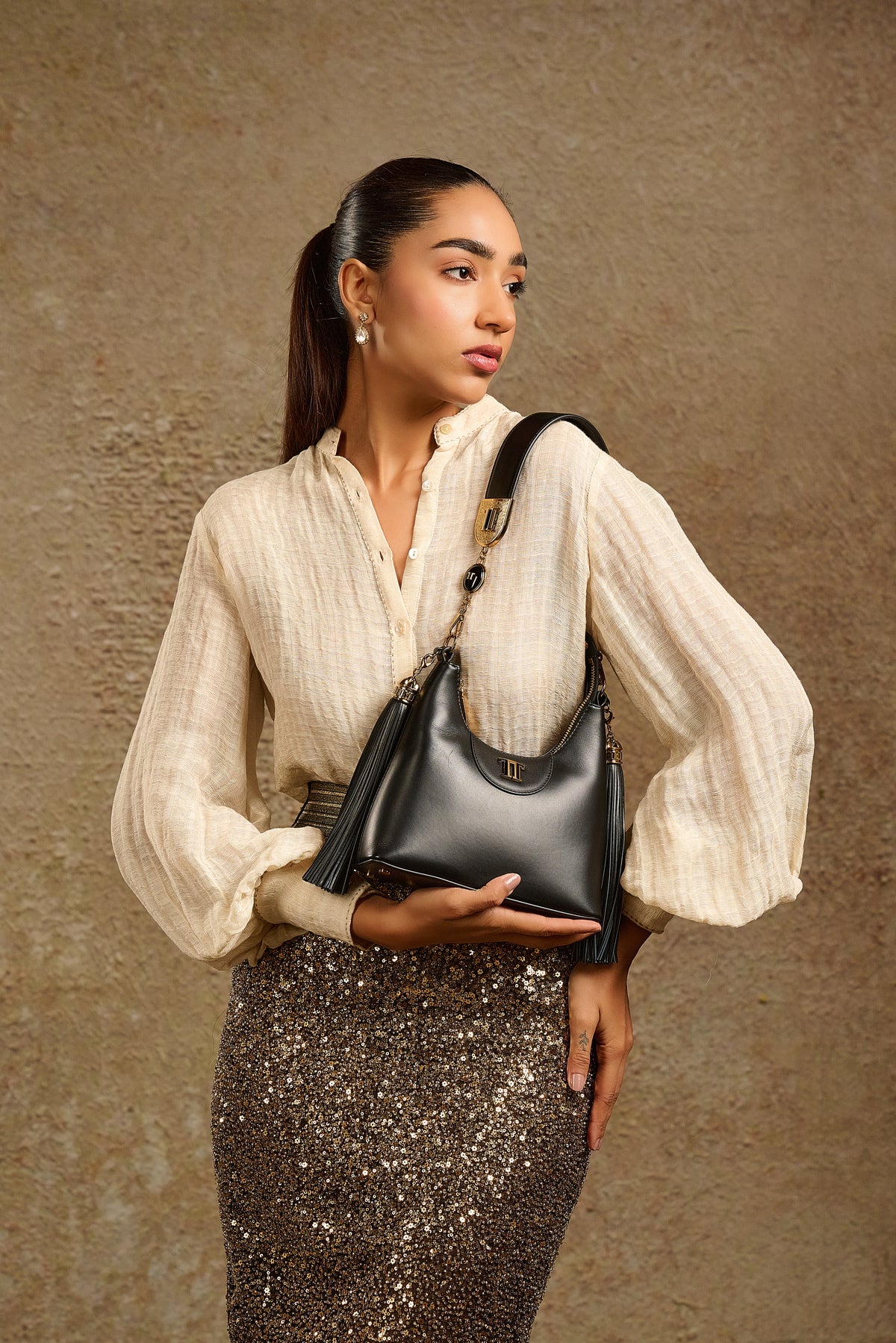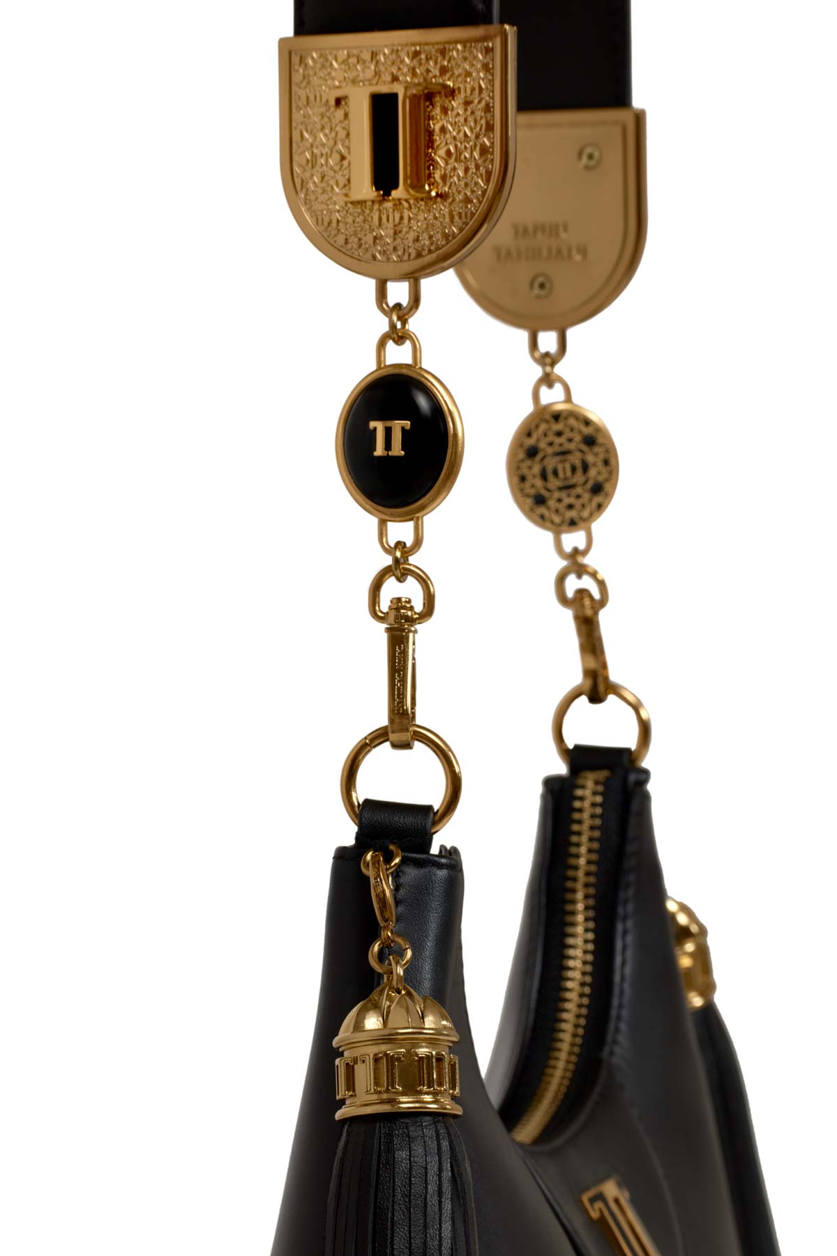 Structured Shoulder Bag Featuring Metallic Tt Monogram Accents On The Strap And Body And Gilded Detailed Tassels