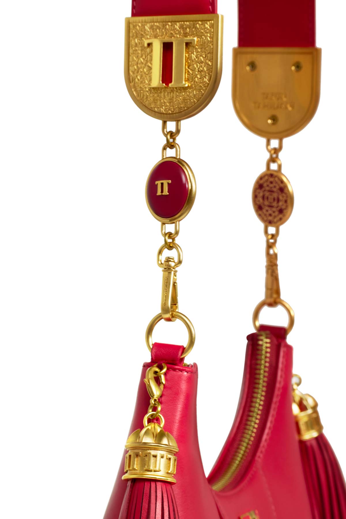 Structured Shoulder Bag Featuring Metallic Tt Monogram Accents On The Strap And Body And Gilded Detailed Tassels