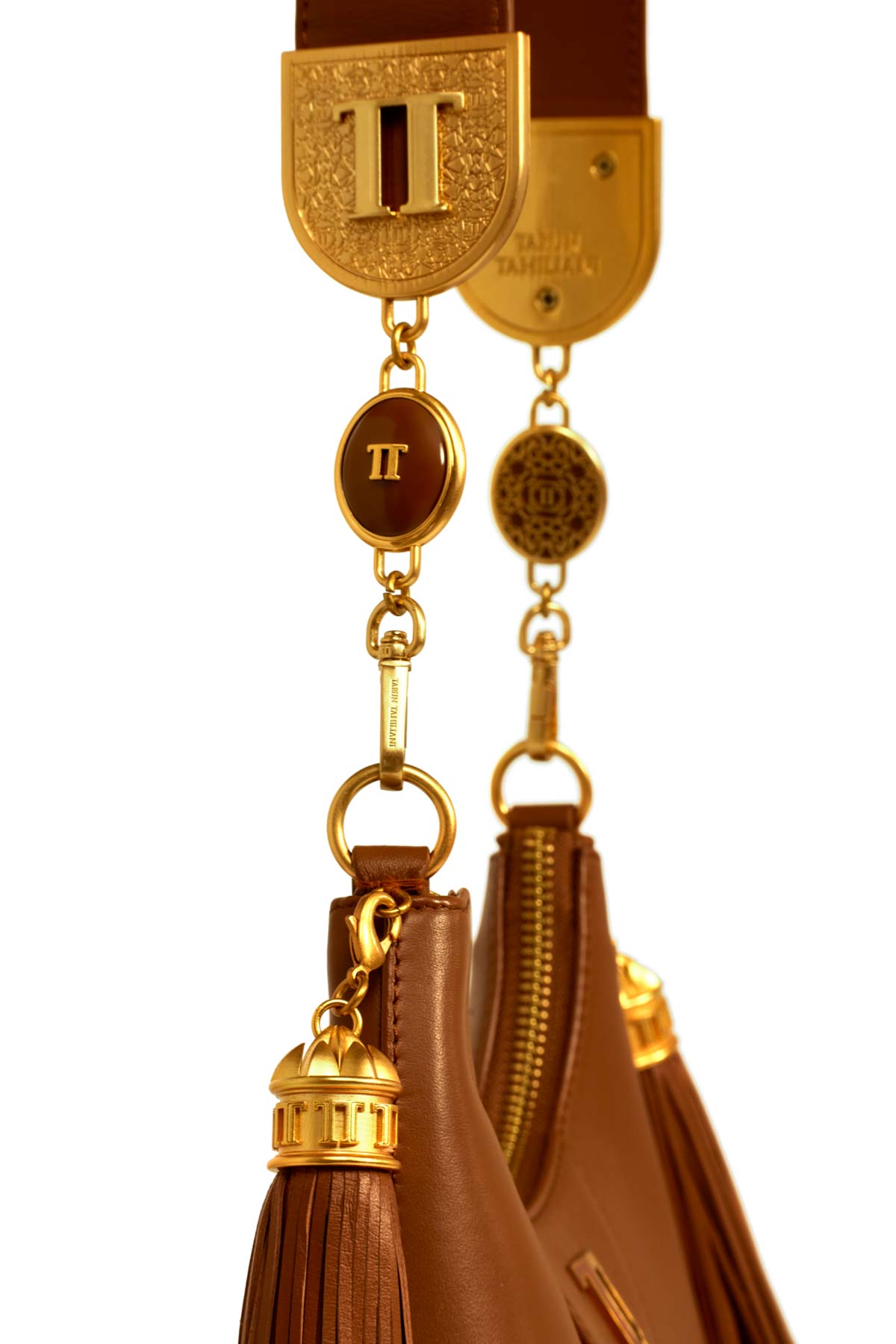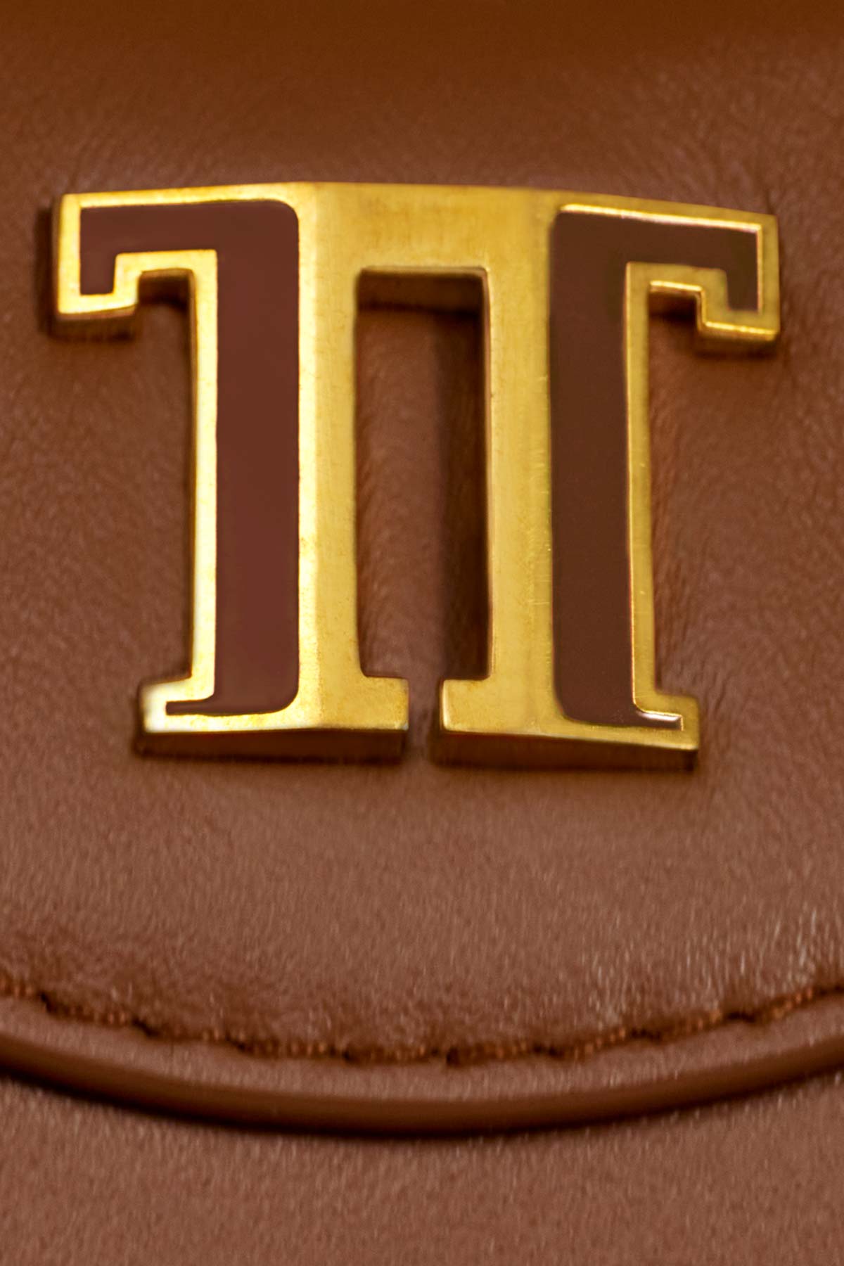 Structured Shoulder Bag Featuring Metallic Tt Monogram Accents On The Strap And Body And Gilded Detailed Tassels