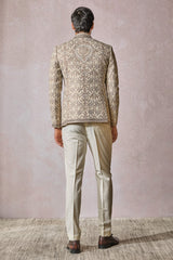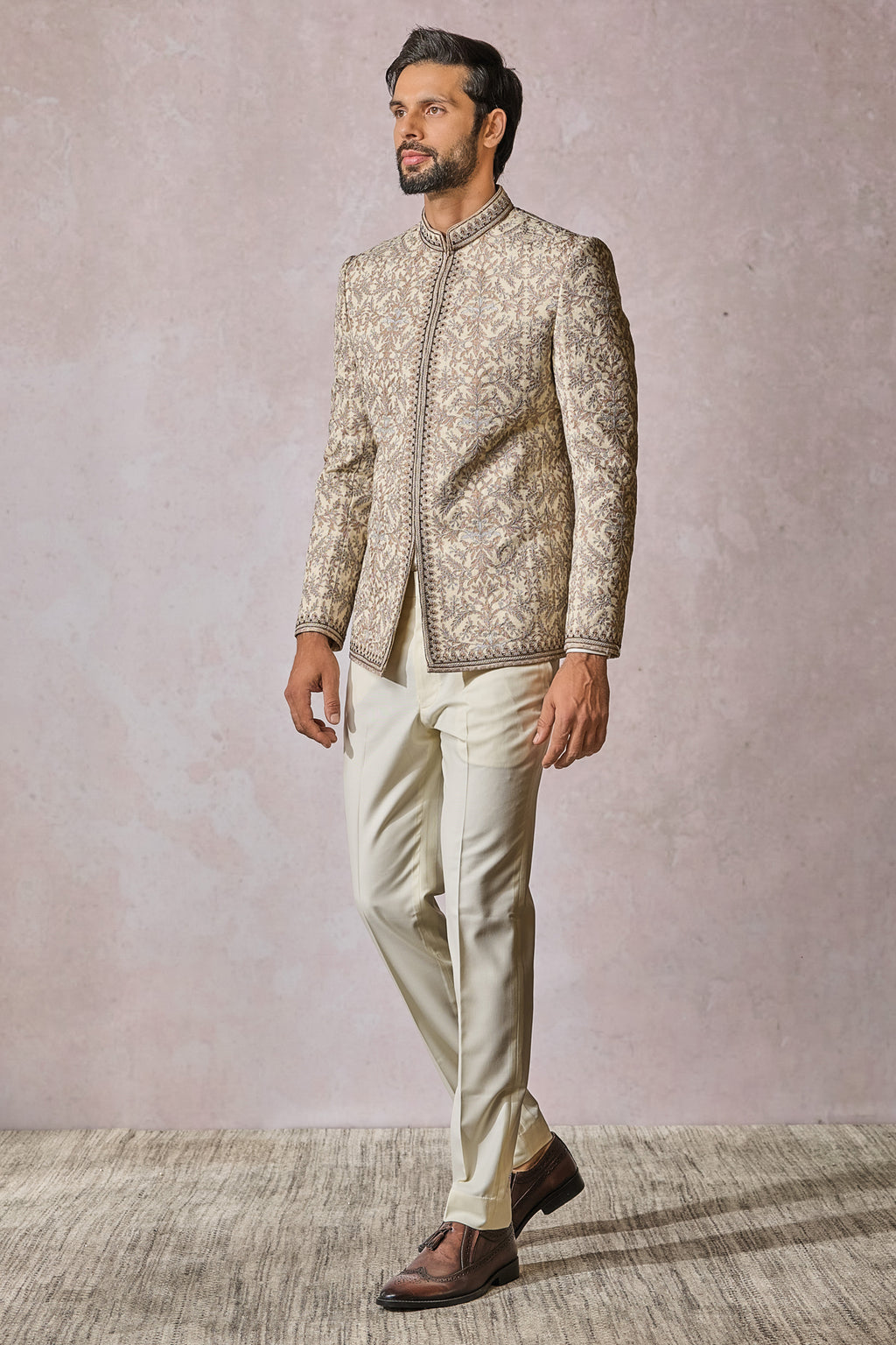 Classic bandgala with gold thread embroidery highlighted with metallic beads and sequins. This sets consists of a classic shirt and trousers.