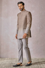 Printed overlapped bandgala with an ombre colour treatment and is paired with a classic shirt and pants.