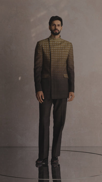 Printed overlapped bandgala with an ombre colour treatment and is paired with a classic shirt and pants.