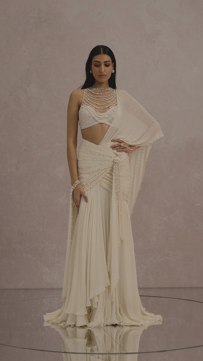 Signature concept saree paired with a blouse adorned with pearl strands and embellished with diamond studs.