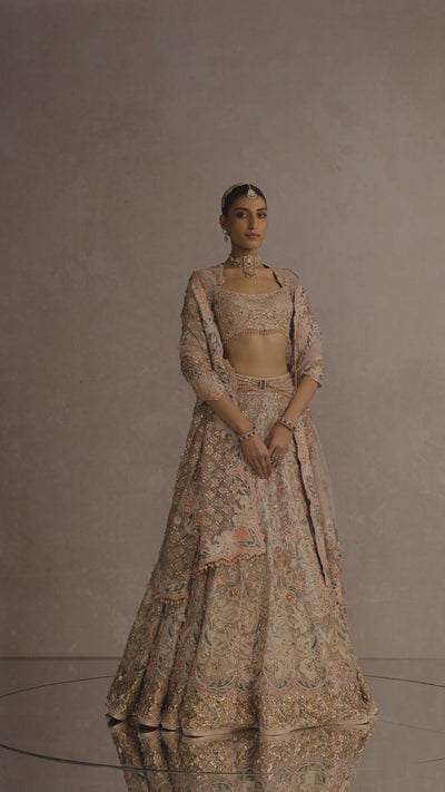 Floral embroidered lehenga highlighted with crystals and sequins is paired with a complementing blouse and dupatta
