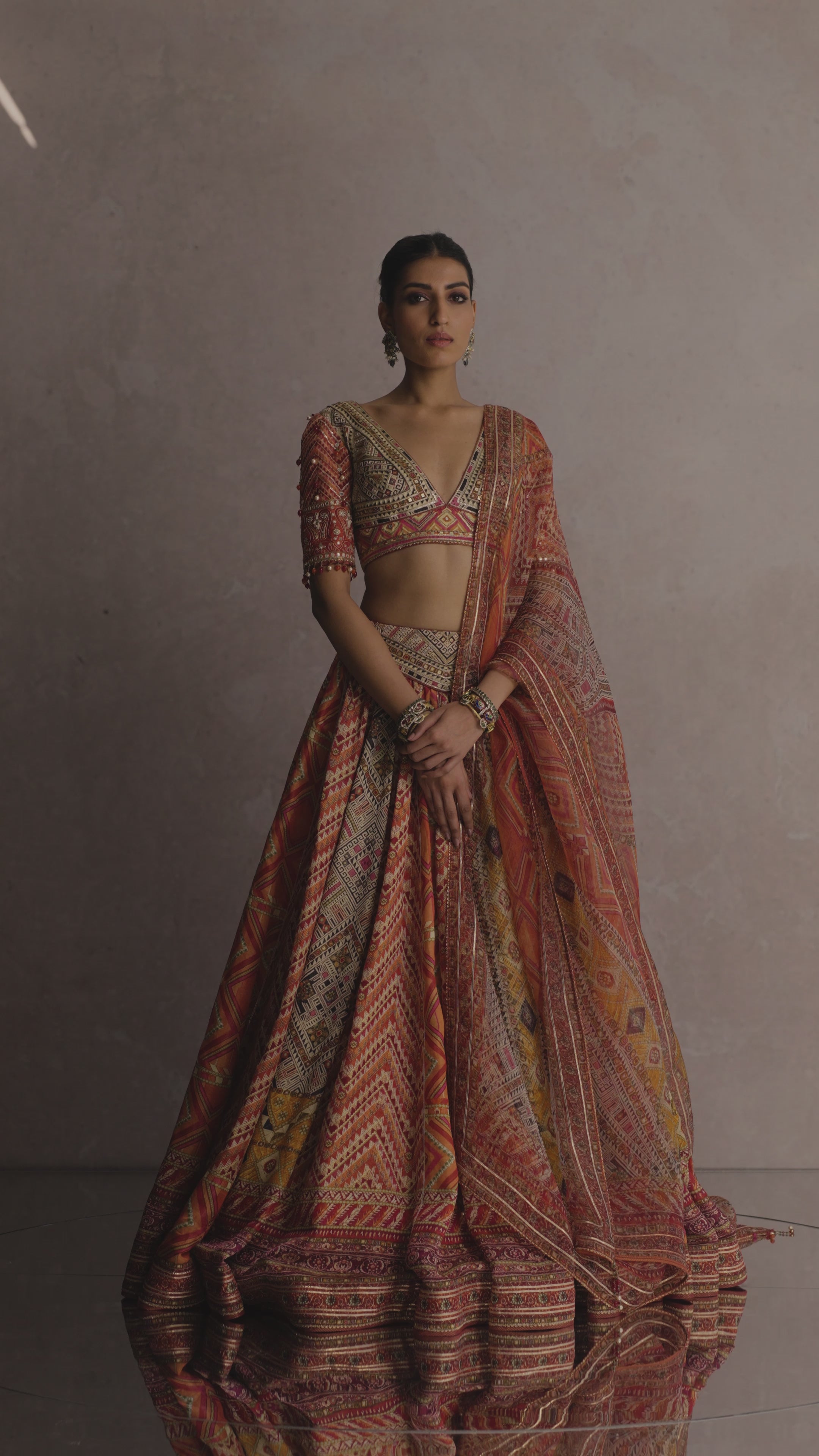 Inspired by Phulkari originating in Punjab, the printed lehenga is paired with