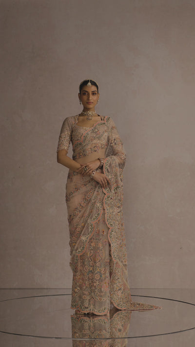 Floral embroidered saree highlighted with crystals and sequins is paired with a complementing blouse
