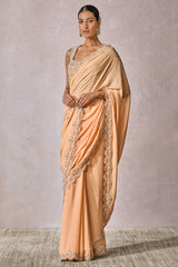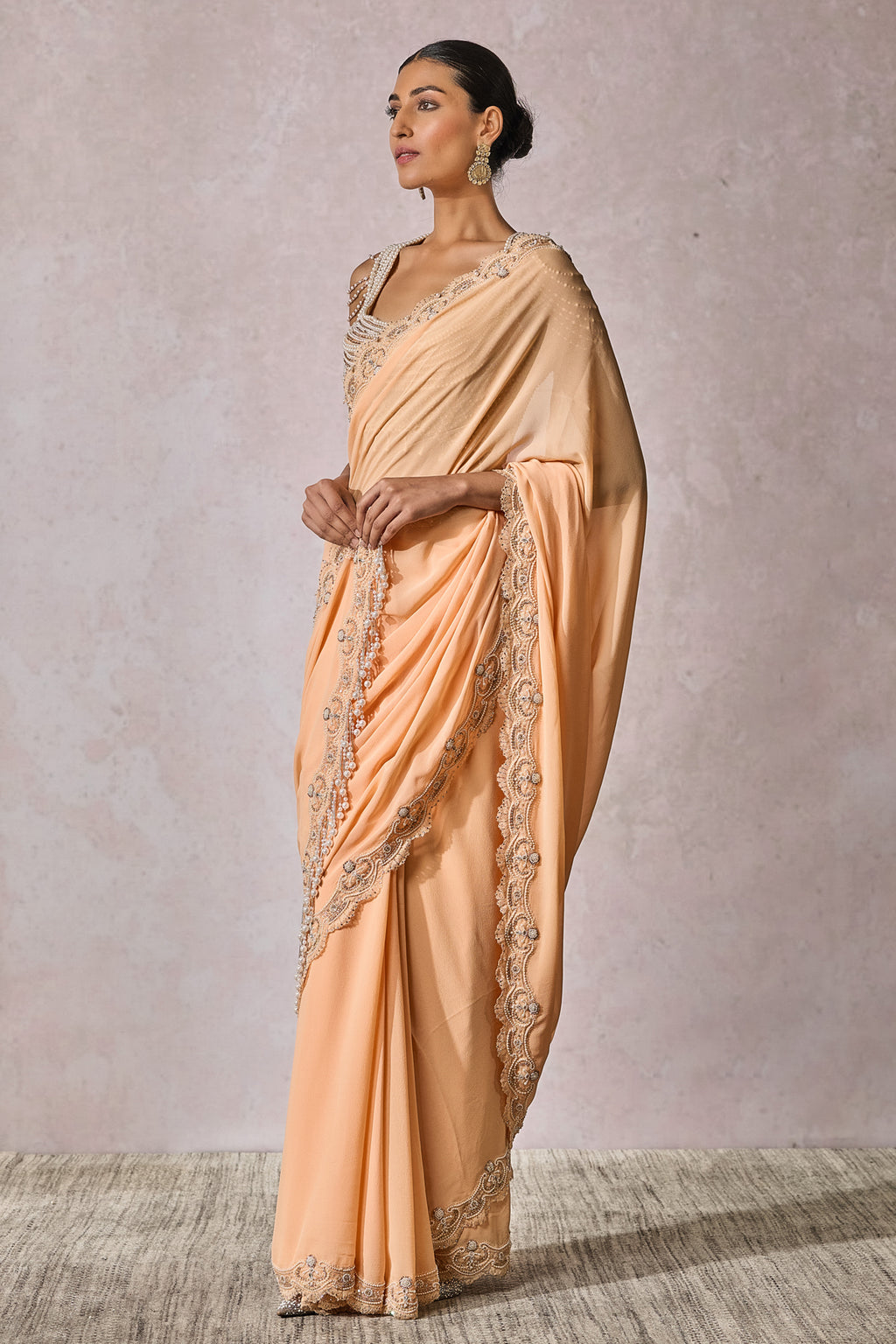 back paired with a classic draped saree, accentuated by embroidered French lace.