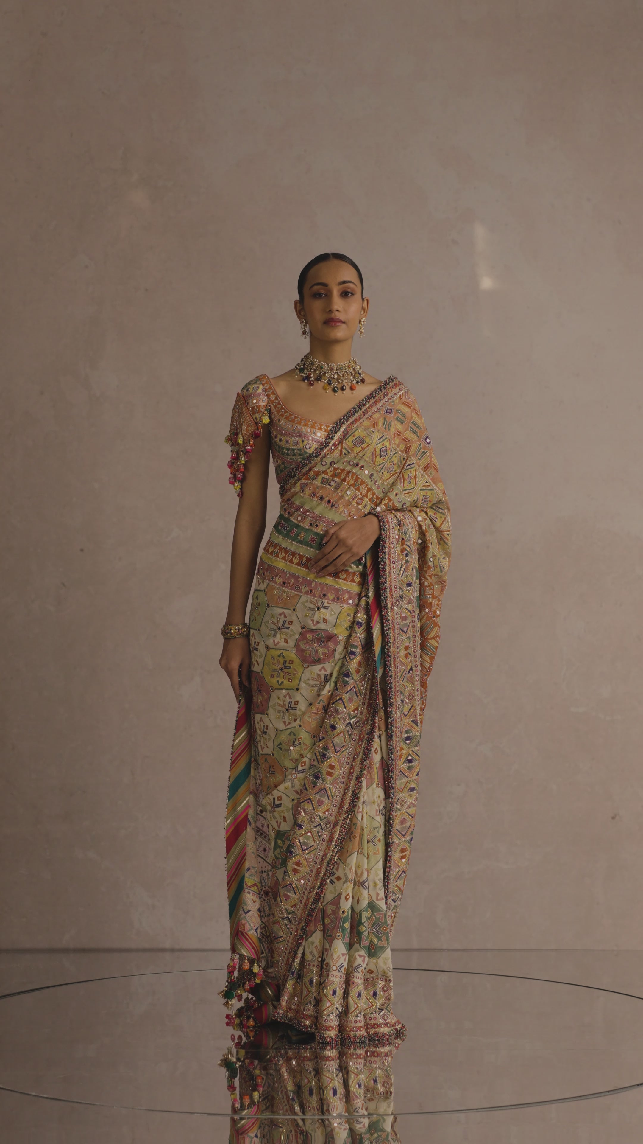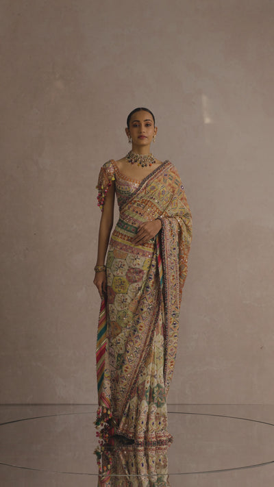 Phulkari-inspired saree featuring vibrant multicolor thread embroidery with sequins, kundan, zardozi, and aari work, paired with a complementing blouse.