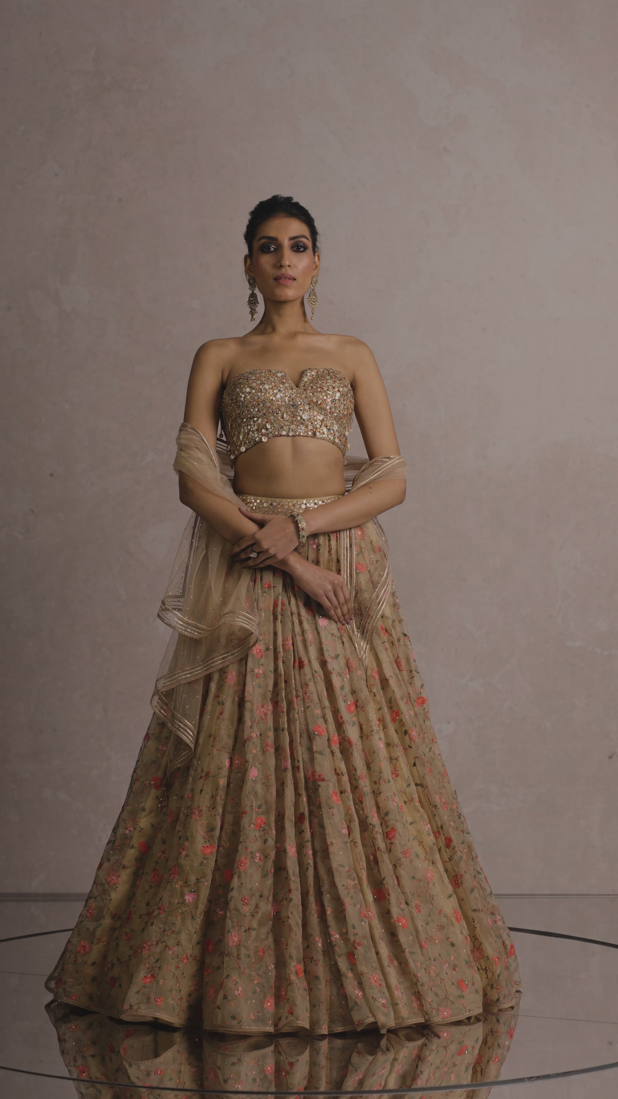 Floral motif embroidered lehenga accentuated with mettalic dome and crystal