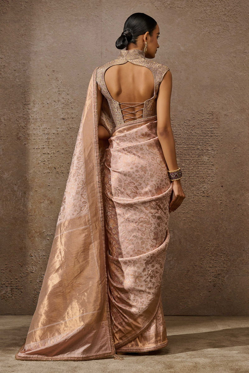 Handwoven brocade classic saree featuring TT signature jaal motifs, is embellished with an intricately hand embroidered border and complemented by a matching with an blouse fabric intricately hand embroidered border and complemented by a matching