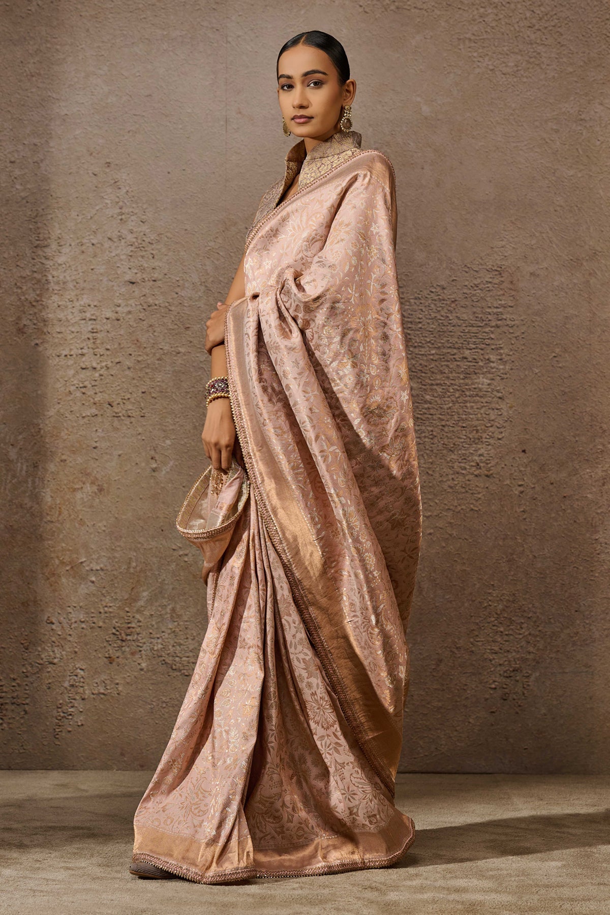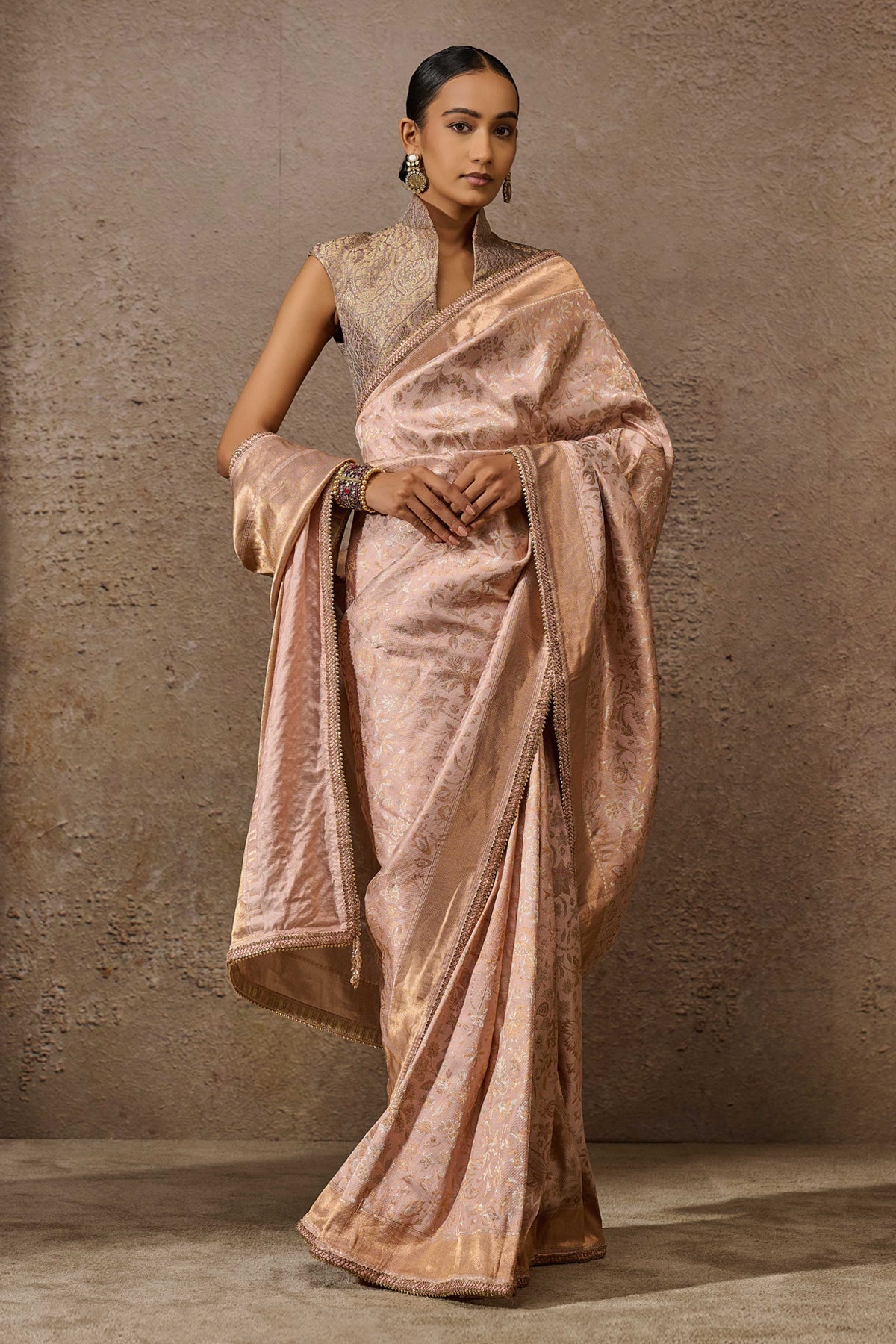 Handwoven brocade classic saree featuring TT signature jaal motifs, is embellished with an intricately hand embroidered border and complemented by a matching with an blouse fabric intricately hand embroidered border and complemented by a matching