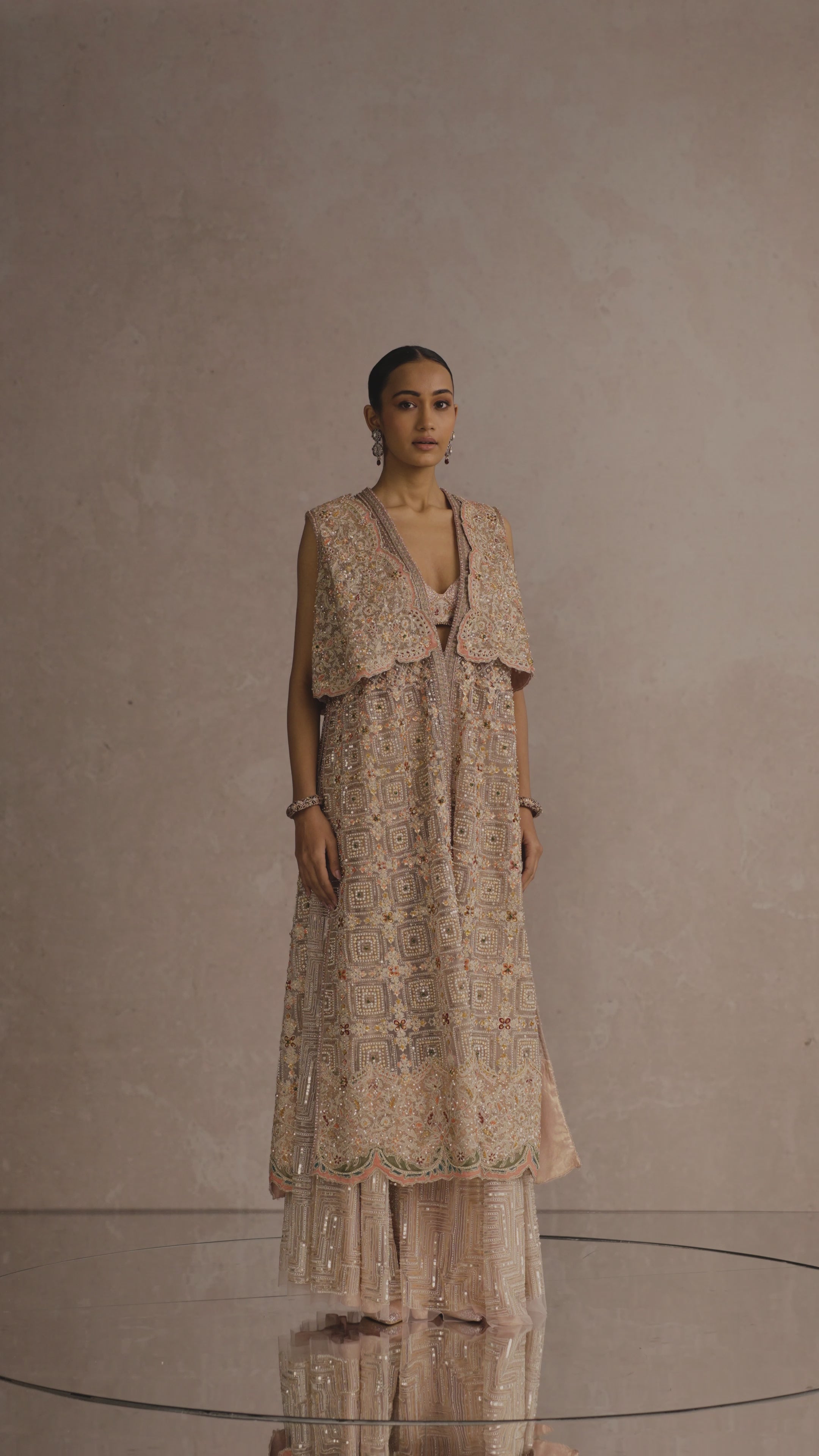 Floral embroidered jacket highlighted with crystals and sequins is paired with a structured bustier and wide legged sharara pants