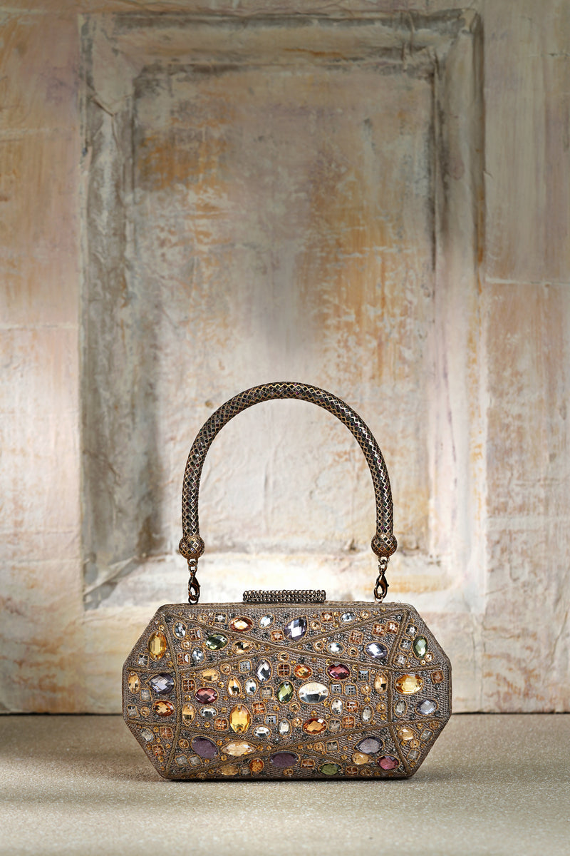 Byzantine Inspirired Octagonal Bejwelled Clutch With A Hand Studded Crystal Handle