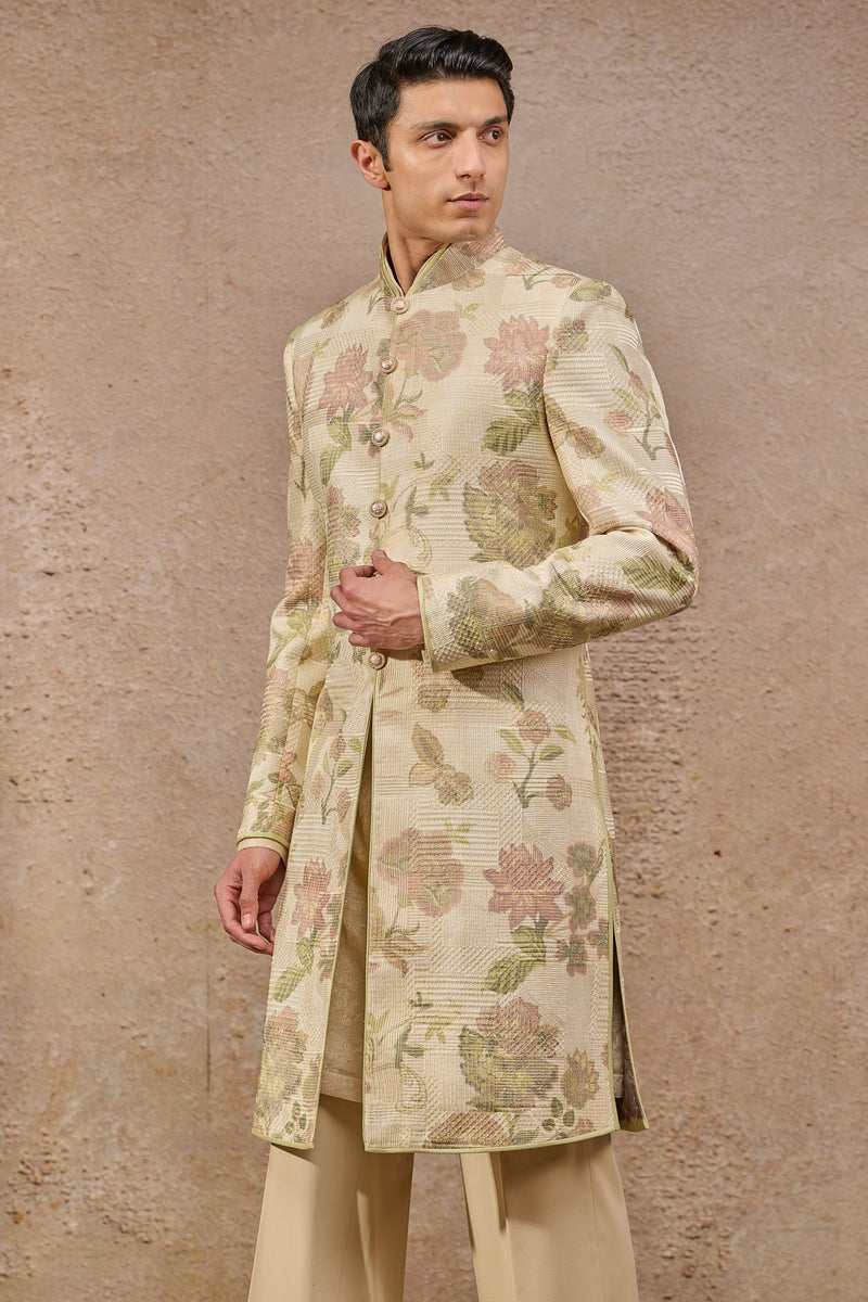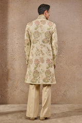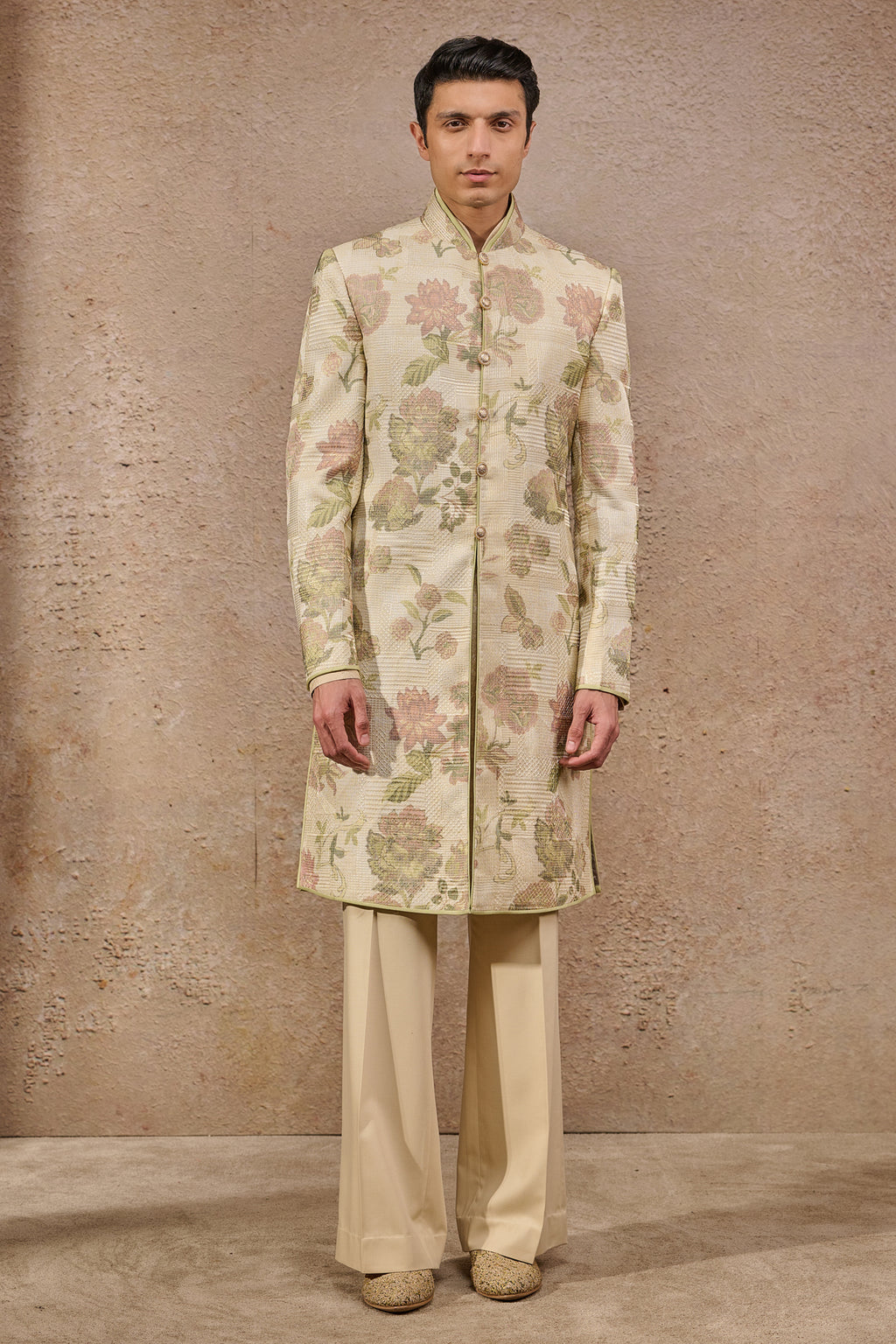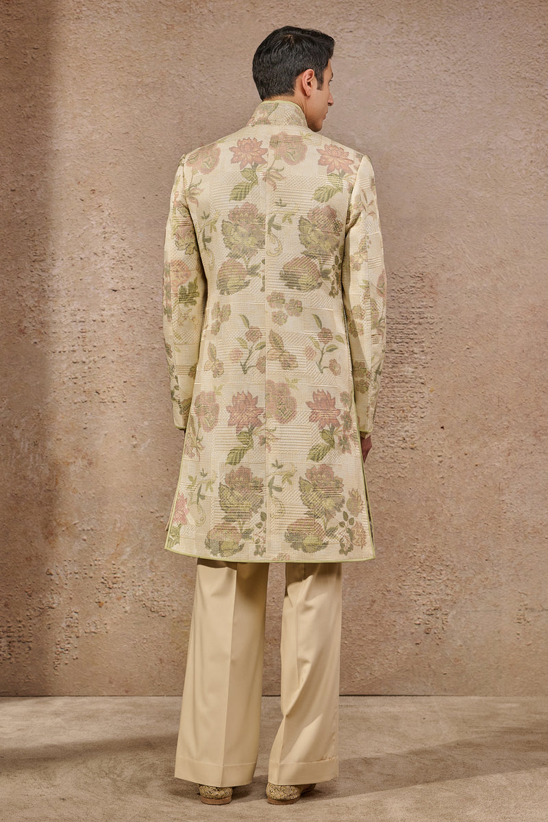 Textured sherwani featuring intricate threadwork on floral motifs, paired with complementing wide-legged trousers