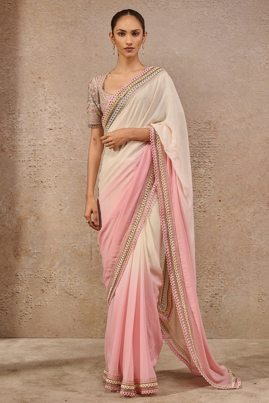 Classic Ombre saree featuring multi-colour lace detail paired with a floral embroidered blouse.