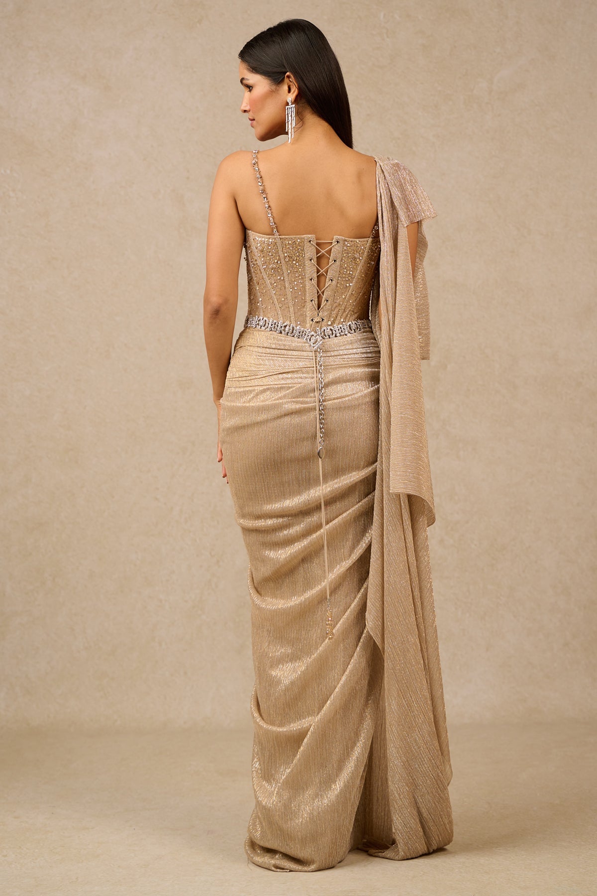It is our draped corsetted concept saree in metallic crinkle fabric with sequin detail in the corset and diamond highlighting.