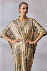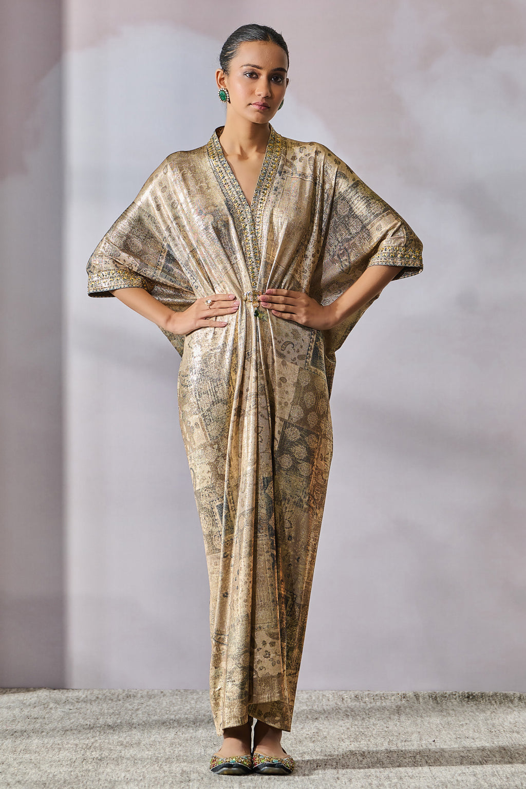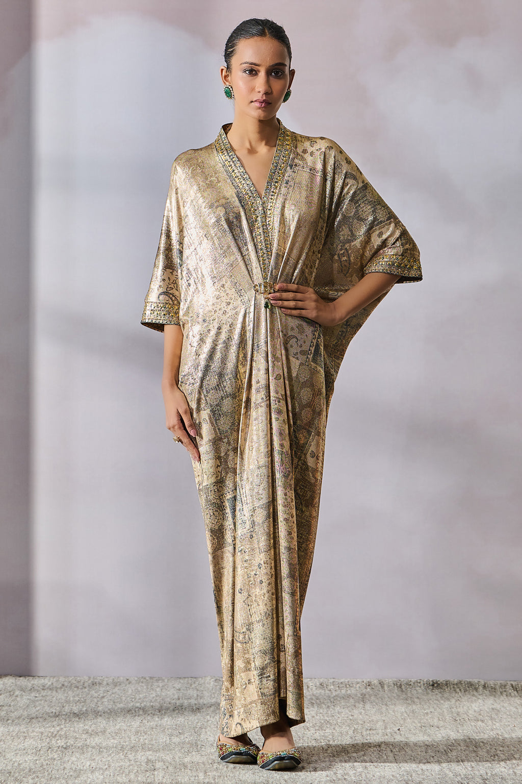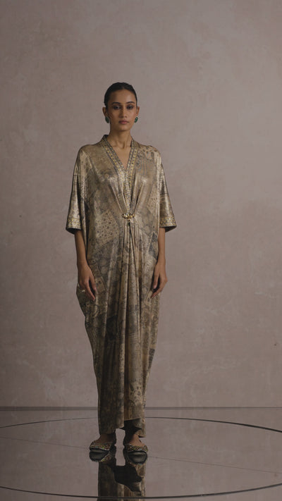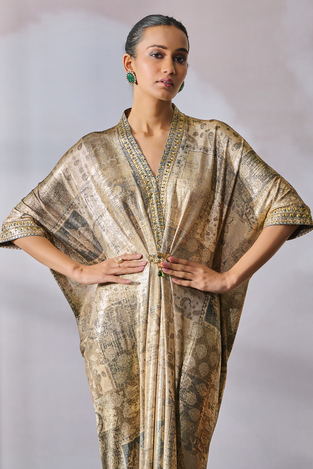 Printed dress accentuated with a jeweled brooch and crystal embellishment.