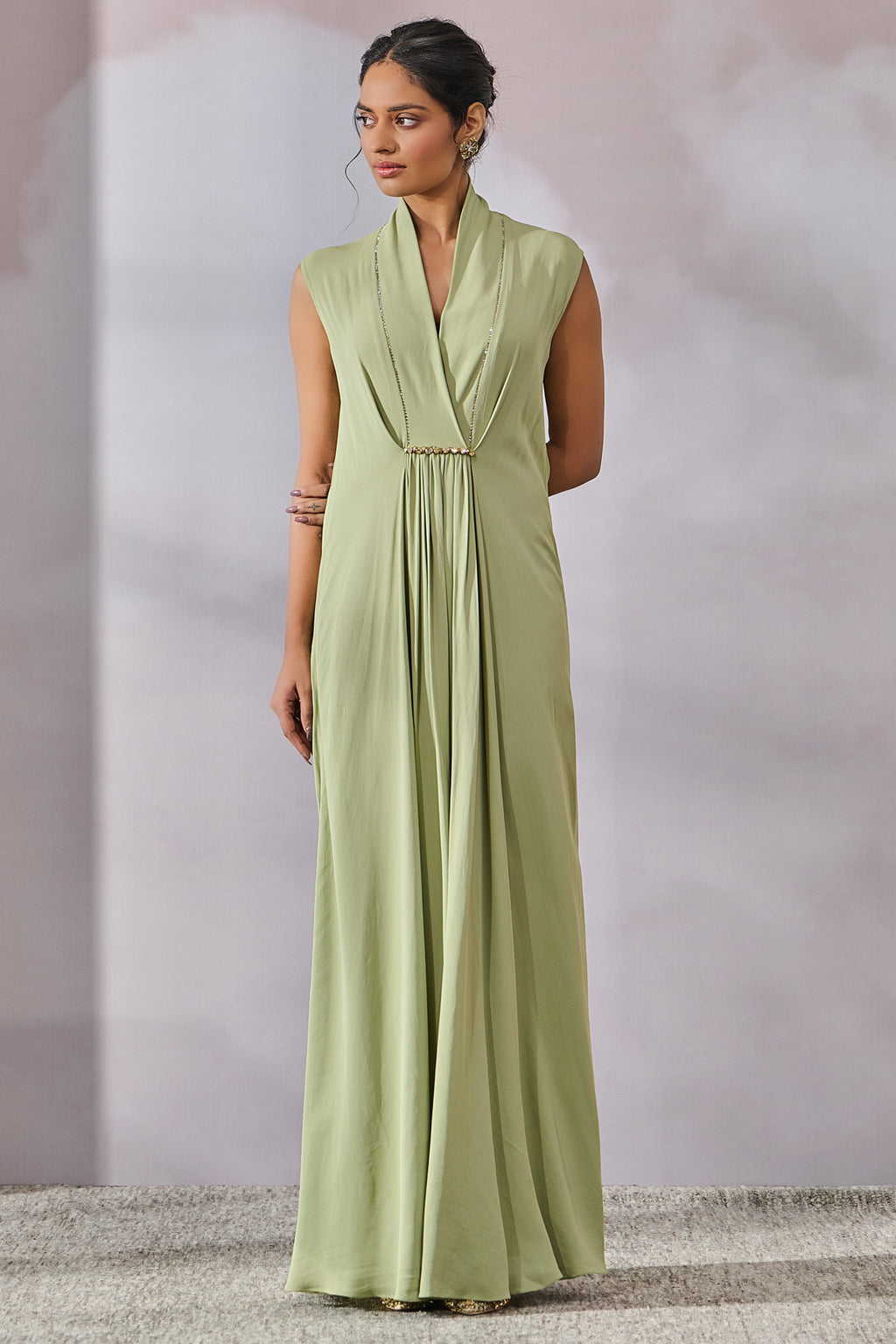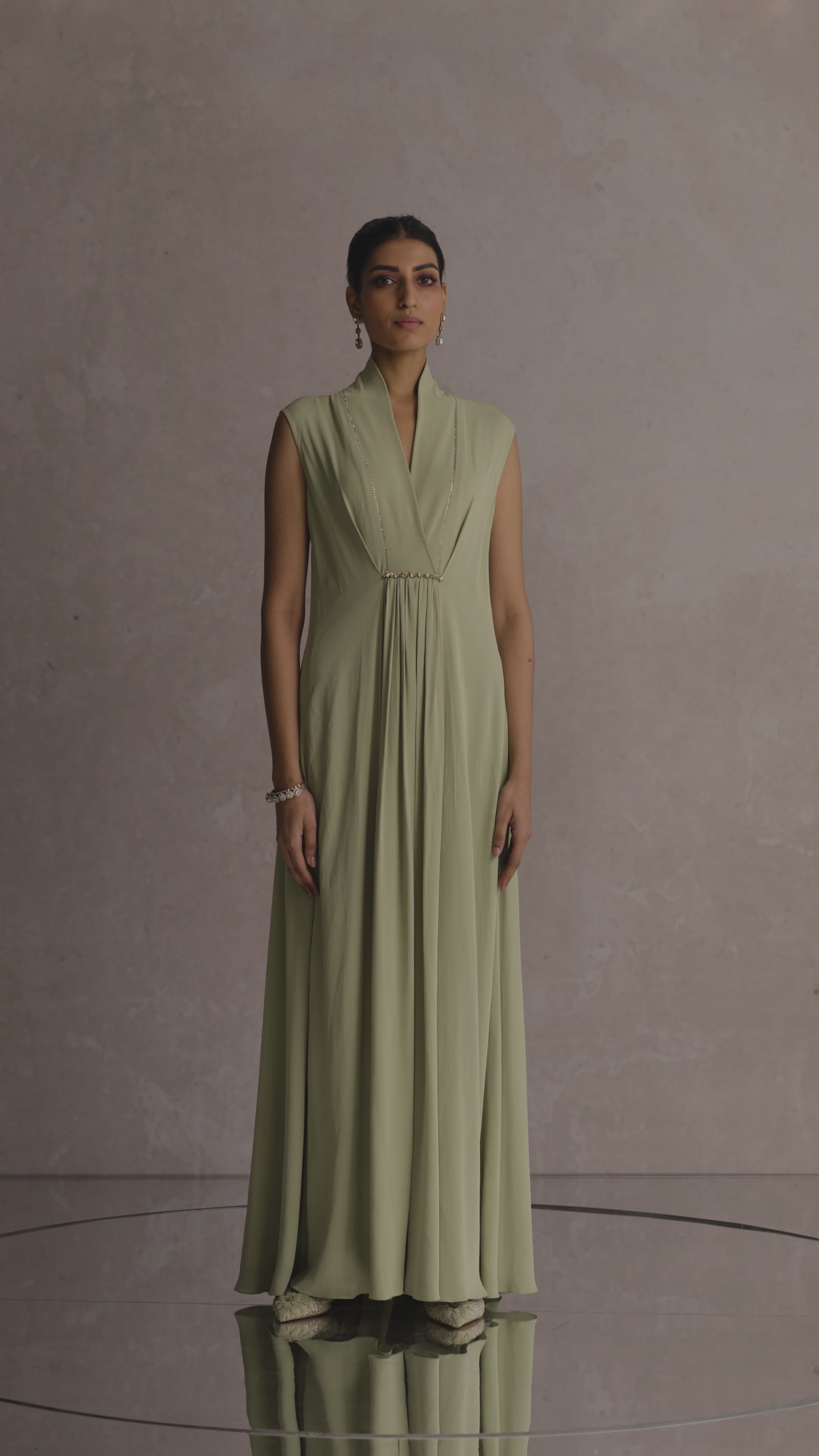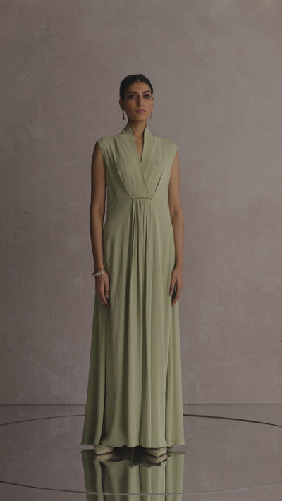 Classic drape dress highlighted using swarovski crystals on waist and neckline.