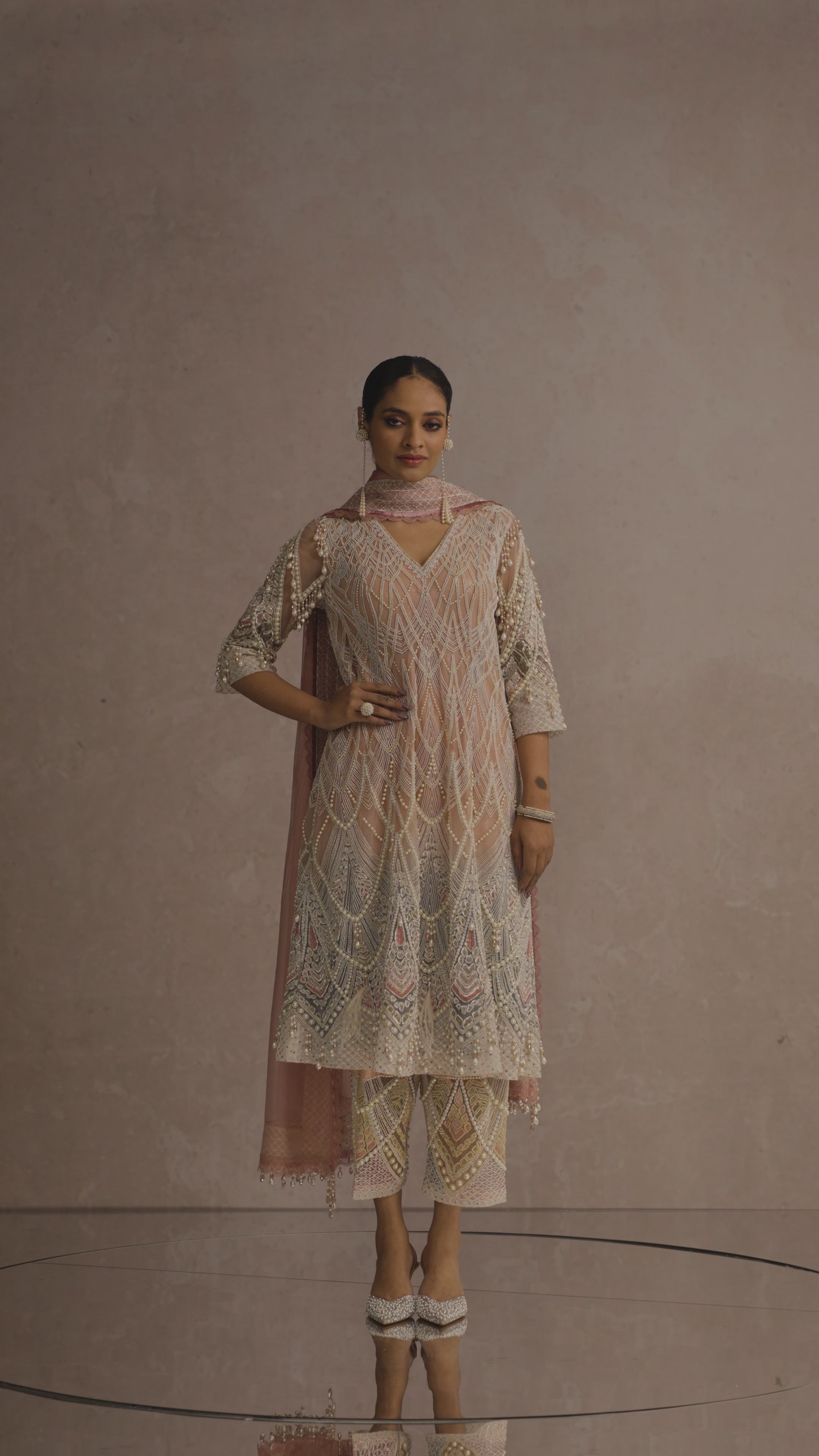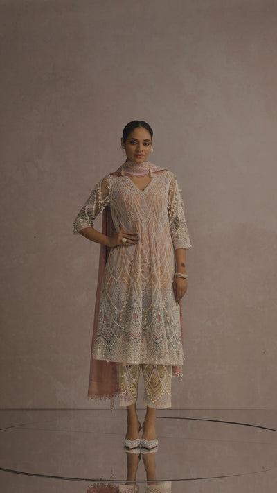 Pearl embroidered with silk yarn and crystal embellishments is paired with a complementing dupatta and pants with pearl embroidery detailing.