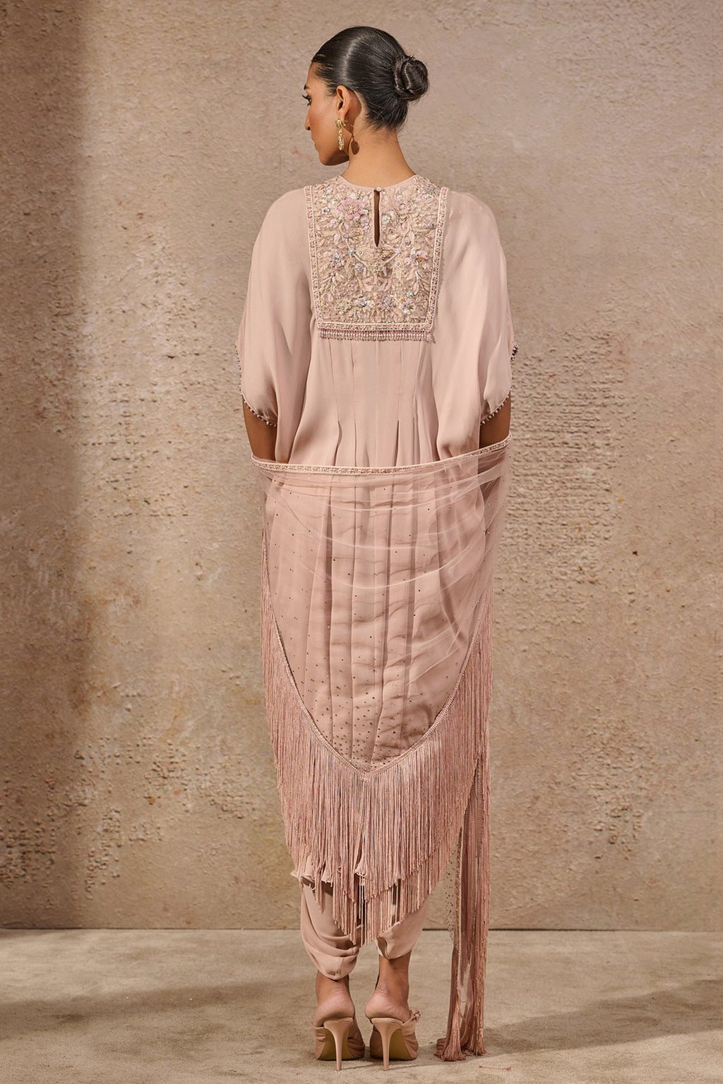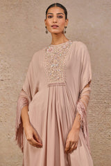 Kaftan-style kurta featuring an intricately hand-embroidered, embellished yoke, paired with a dhoti and a complementing fringed scarf.