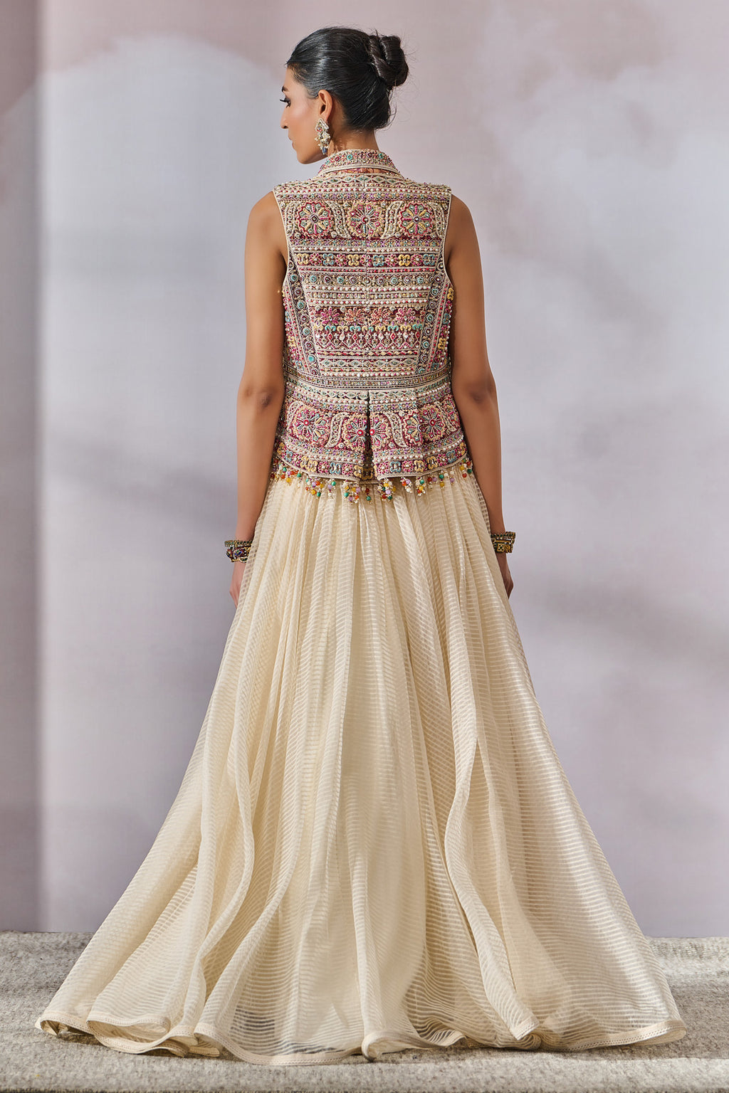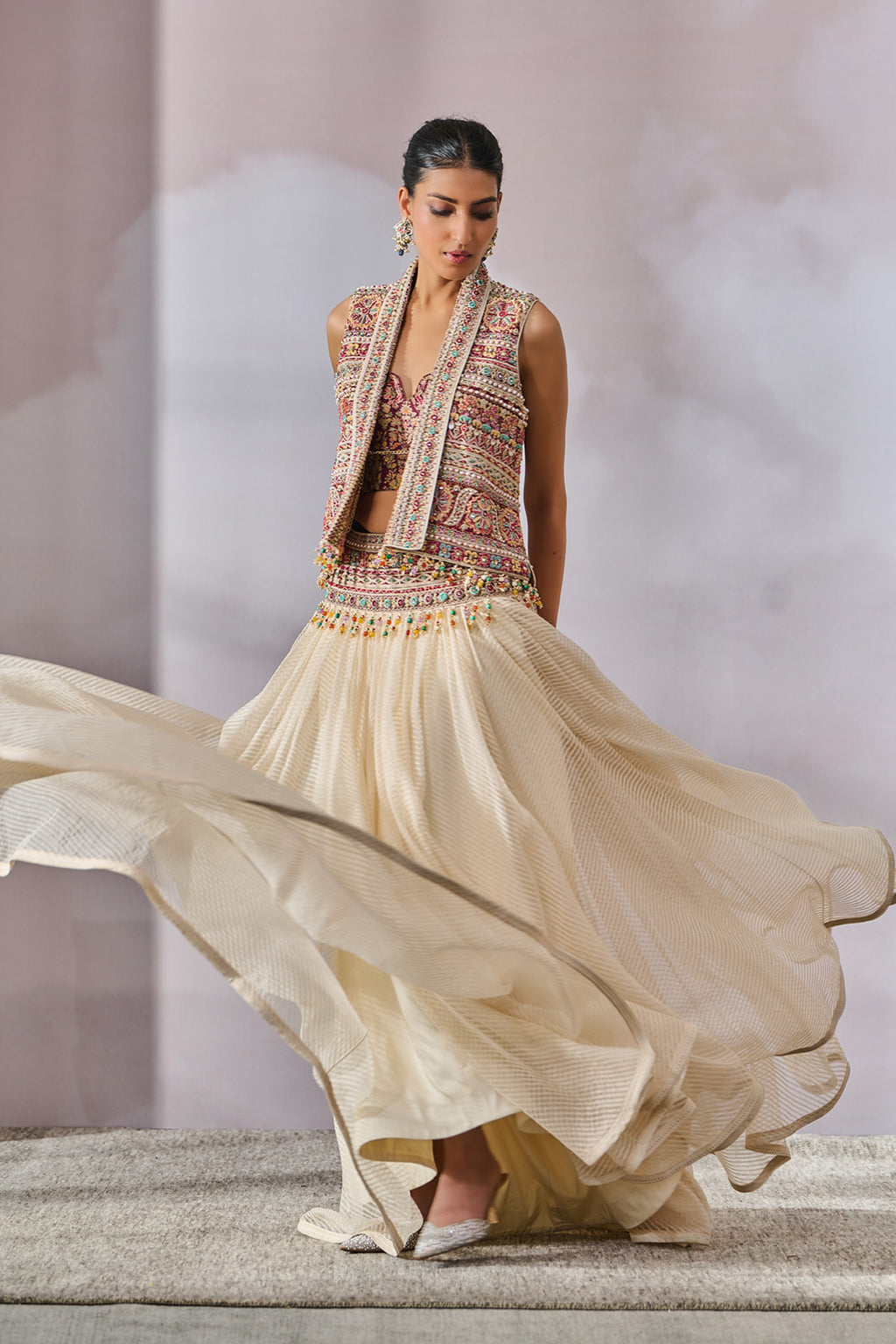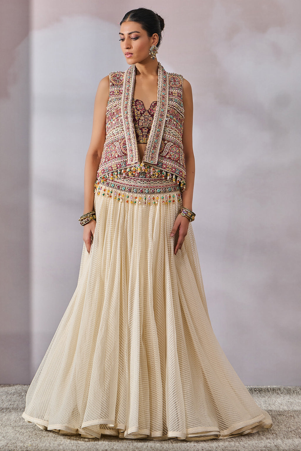 Printed And Hand Embroidered Gilet Is Highlighted With Crystal Fringing.