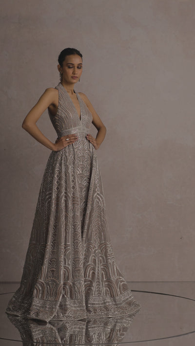 A classic sequin embroidered cocktail gown with pearl accentuations.
