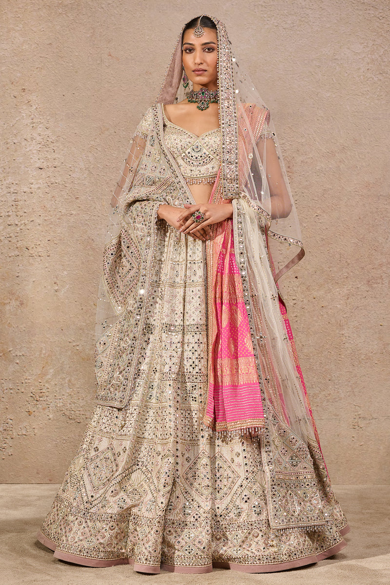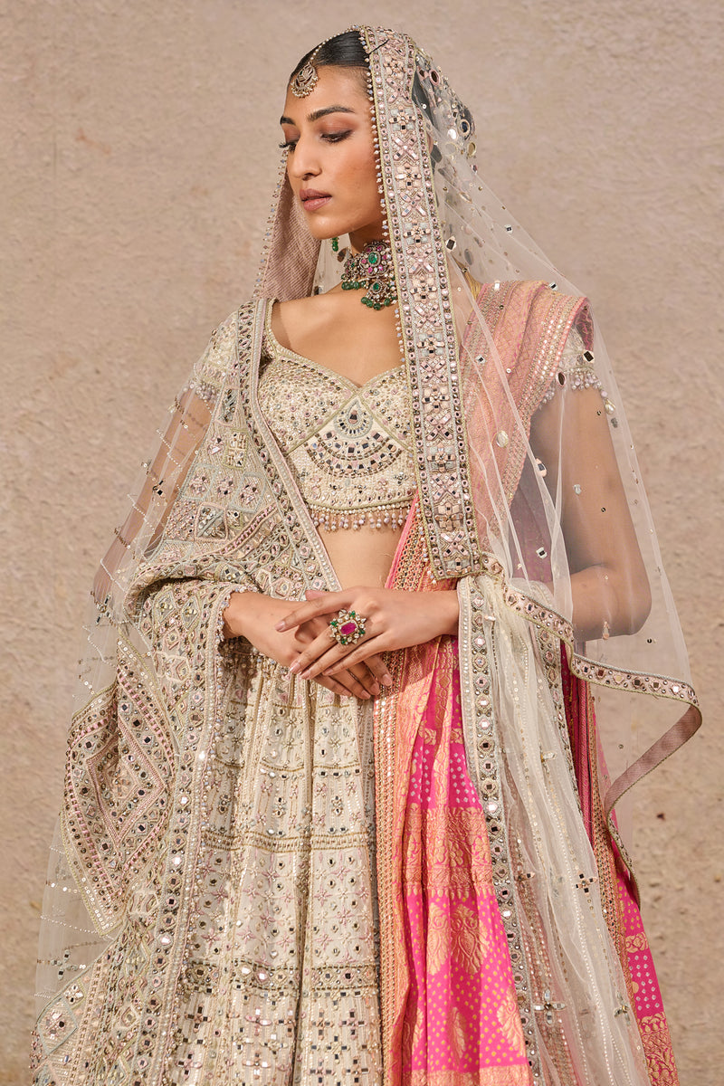 Hand-embroidered mirror work lehenga, paired with a complementing embroidered blouse, an intricately embellished dupatta,patka and a delicate veil.