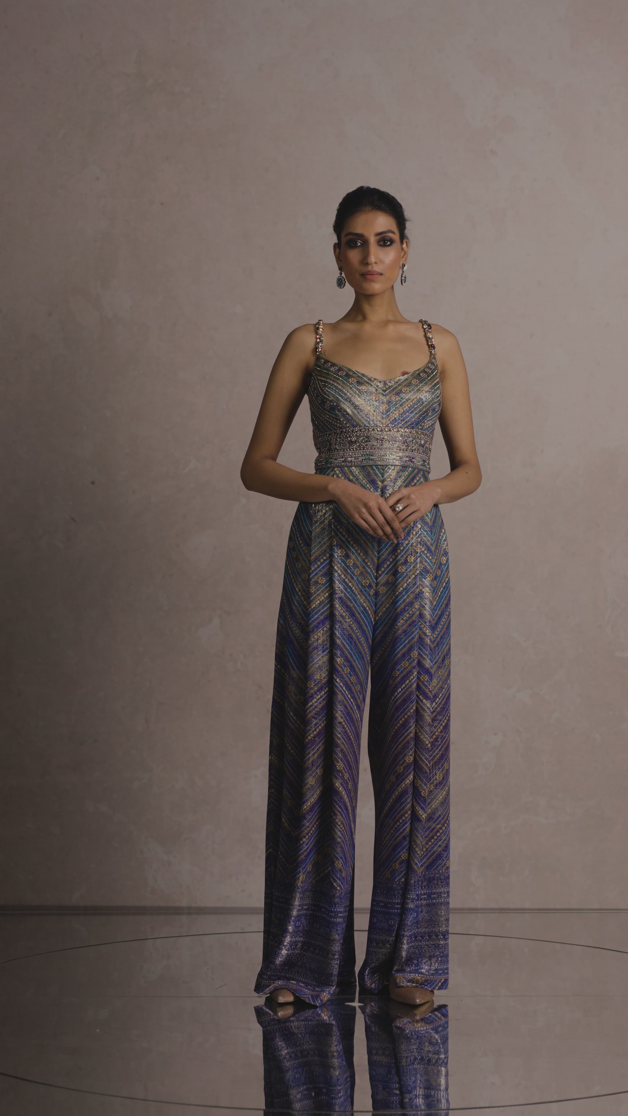 Abstract geometric print jumpsuit accentuated with crystal embellishments
