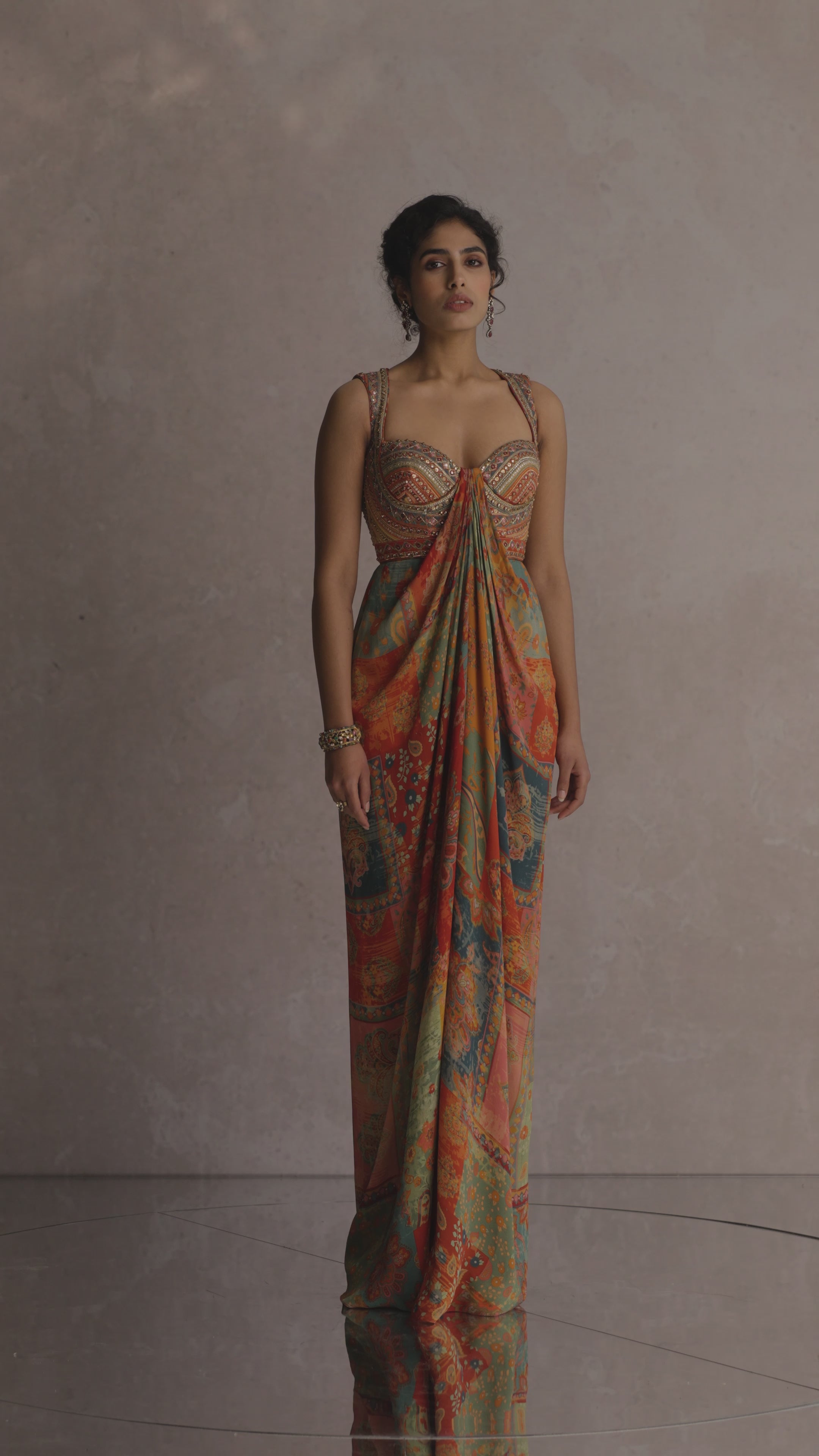 Inspired by Phulkari, the printed jumpsuit features a structured hand embroidered bodice.