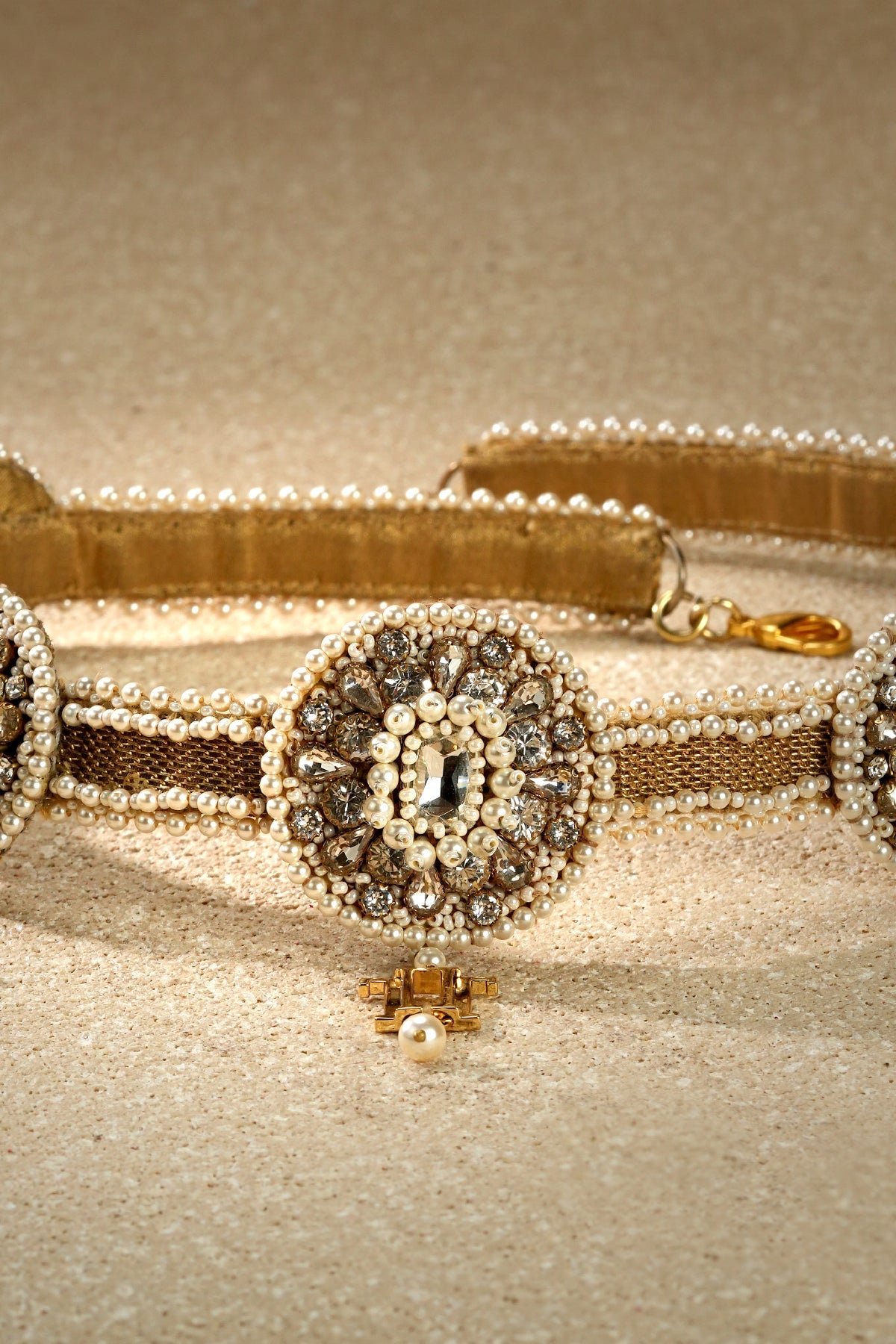 Gold metallic mesh chain with handcrafted floral motif units made with pearls, Swarovski crystals and crystal jewels.