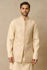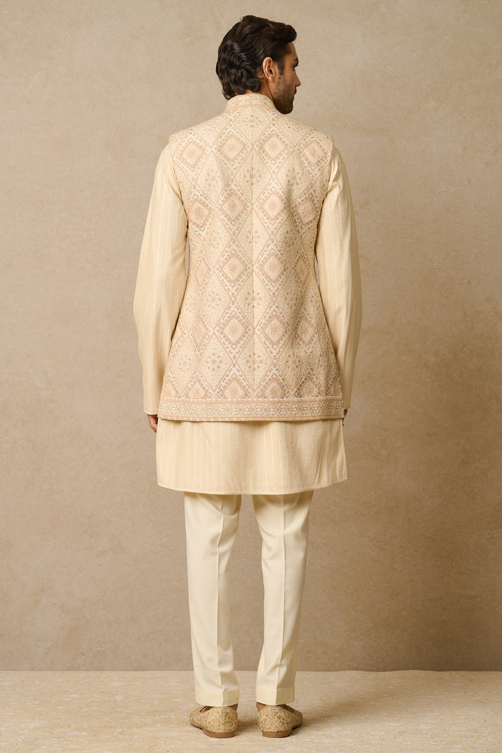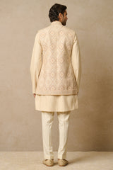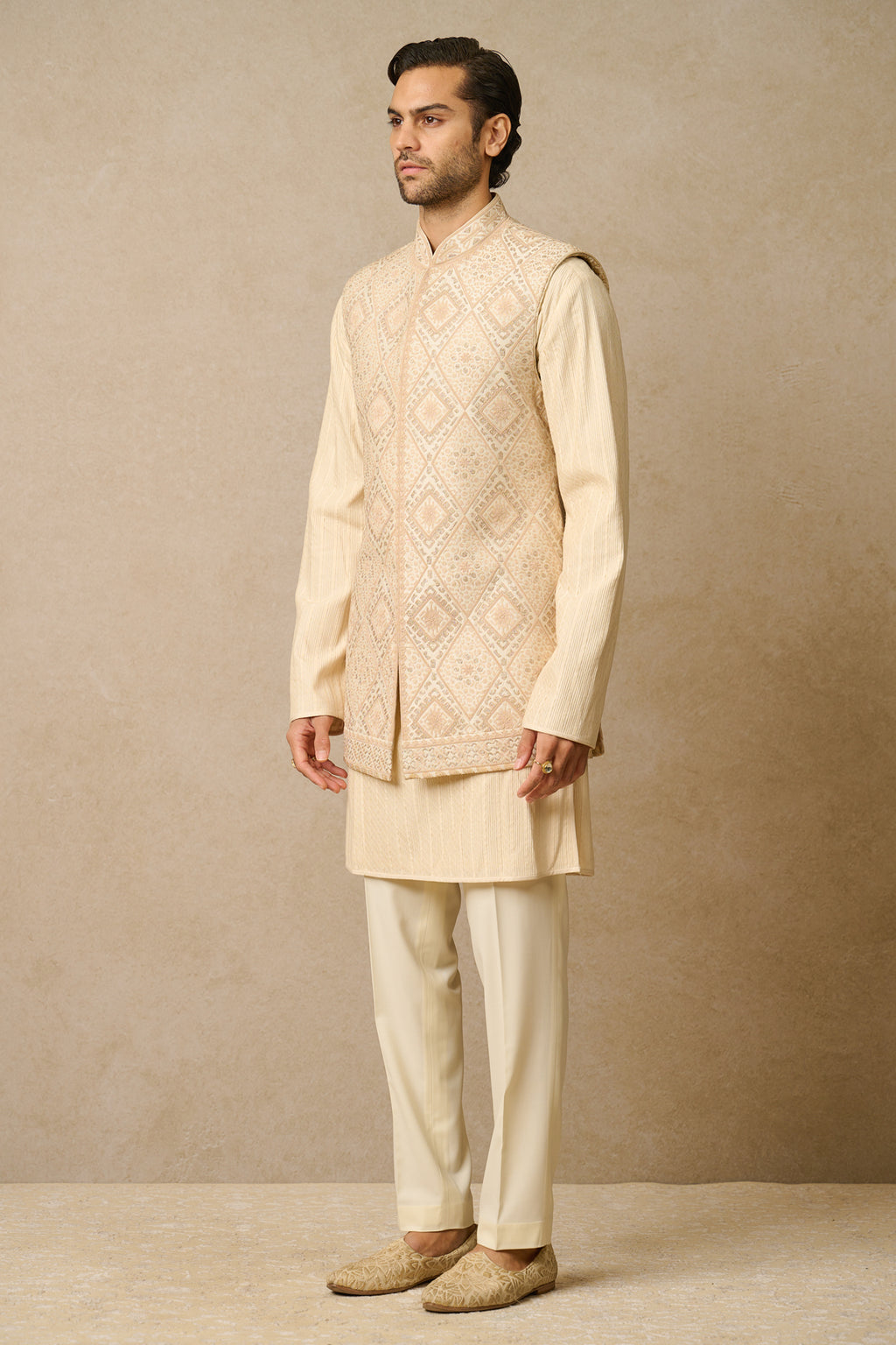 Our silk kurta is highlighted with elaborate yoke, fine aari embroidered borders and pearls. This kurta is paired with complementing trousers.