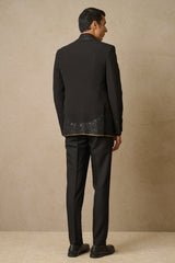 A placement embroidered bandhgala highlighted with matt sequence paired with classic Shirt and Trousers.