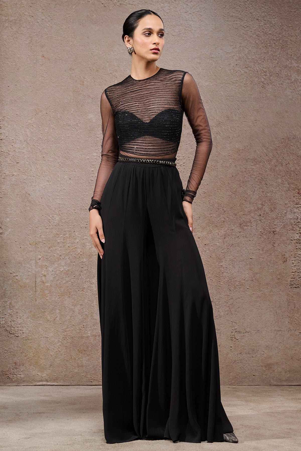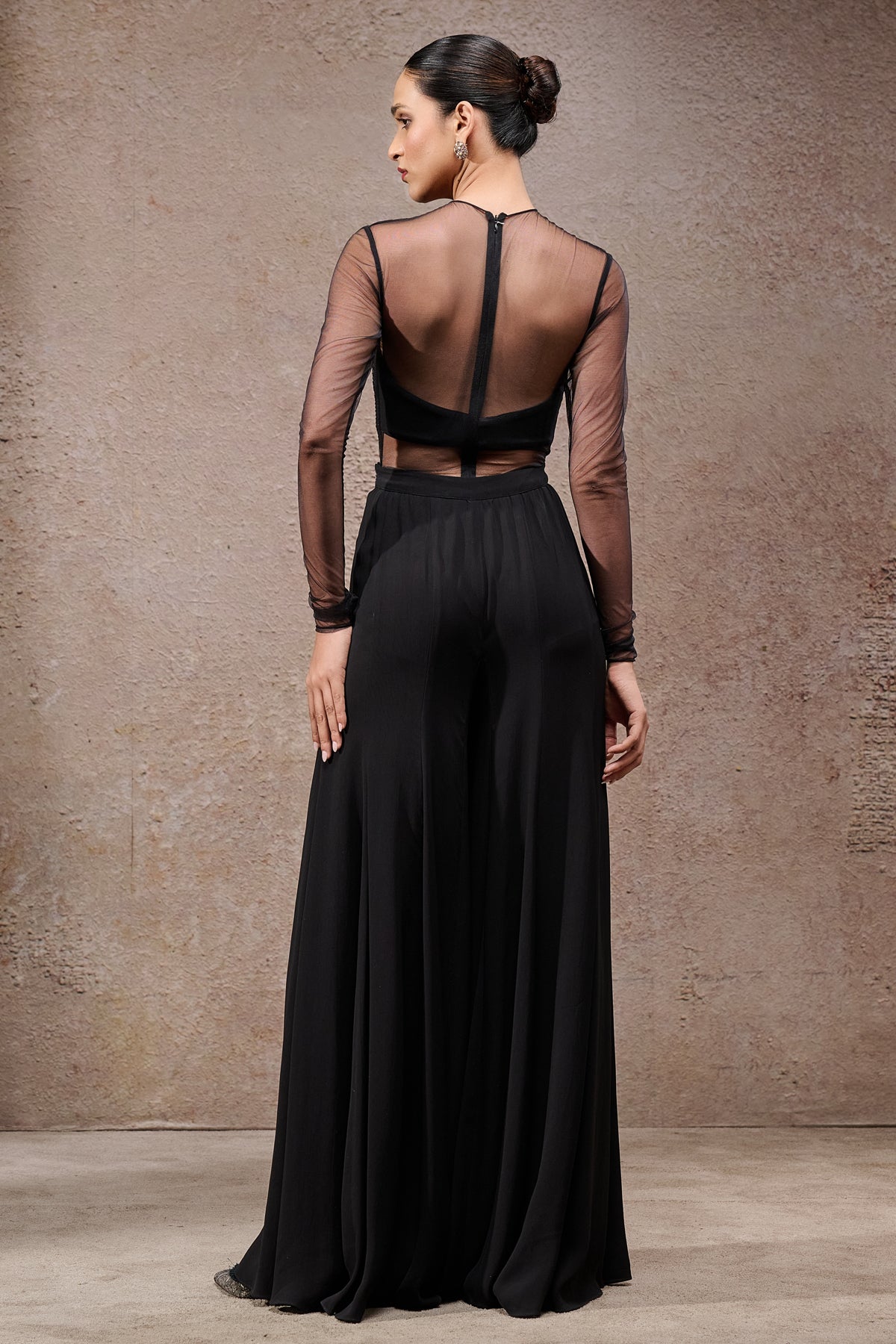 Classic Mukaish Cape Paired With Flared Trousers And A Fitted Bodysuit.
