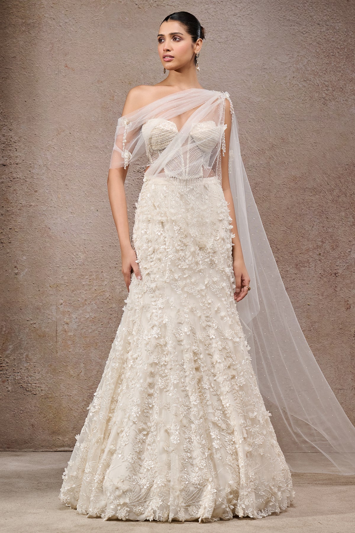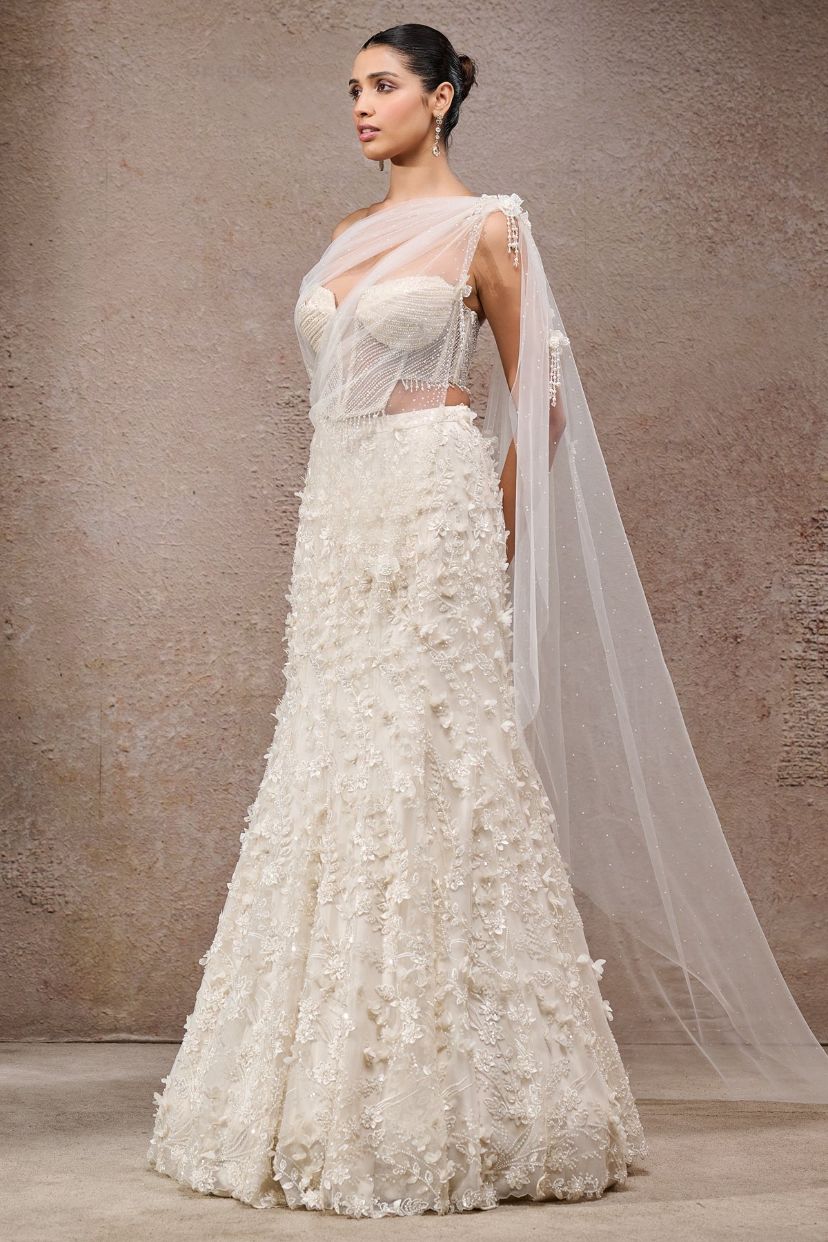 Pearl-Embroidered Lehenga Saree Paired With A Hand-Embroidered Corset And A Fluid Drape.