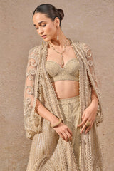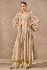 Resham embroidered jacket embellished with crystal, sequin, pearl, and beads paired with a bustier and crystal-detailed lace pants