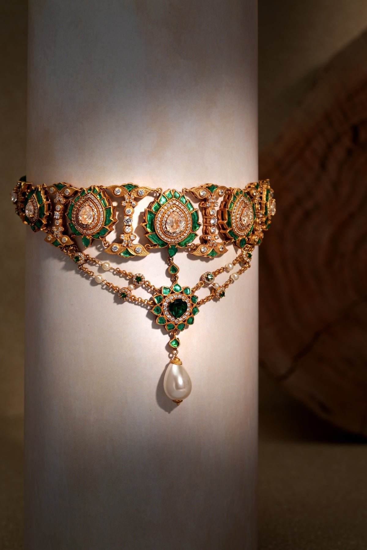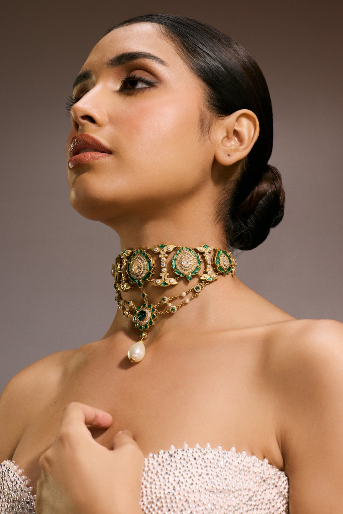 Rubies set in the pattern of leaf motifs, the choker features an extended drop down chain with swarovski crystals and pearls with a crystal encrusted ruby flower pendant