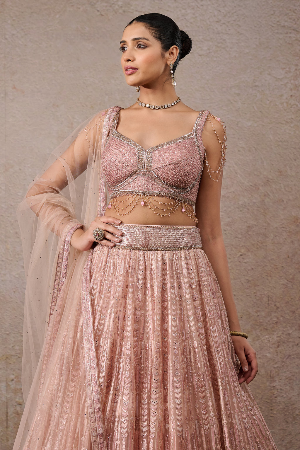 Sequin-Embroidered Lehenga With A Tt Signature Embroidered Hip Yoke, Paired With A Hand-Embroidered Blouse Featuring Intricate Sequin Work And Swarovski Crystals. The Look Is Finishing With A Complementing Dupatta.