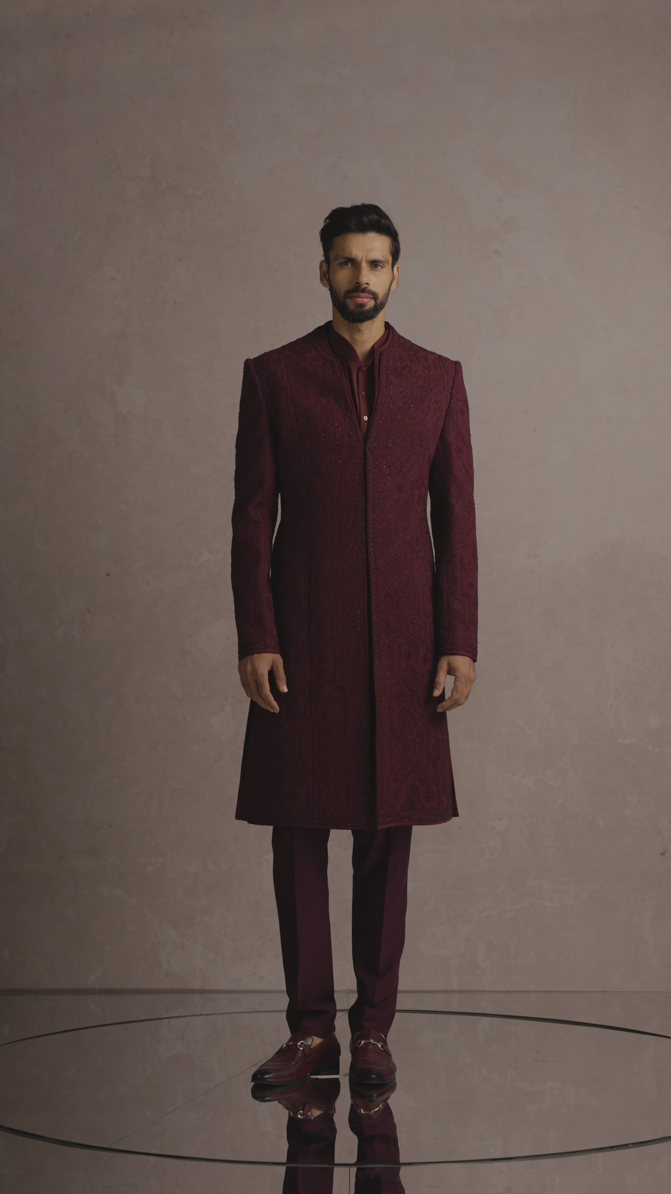Tonal sherwani intricately detailed with fie silk threads, diamonds, sequins, and beads is paired seamlessly with a silk kurta featuring texture detailing and complementing trousers