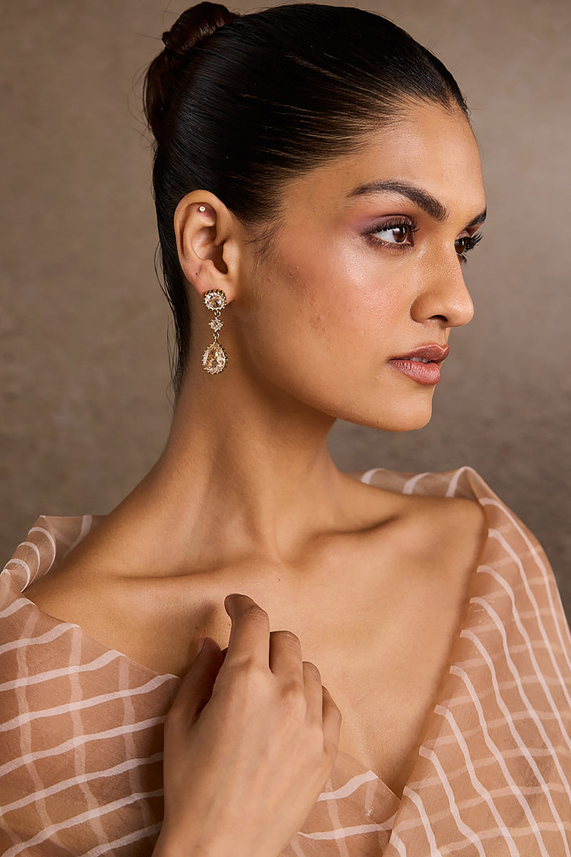 Pear, cushion and round linked earring set in crystals and Tt Jaal crafted at the back. Silver earrings designed in silver 92.5 dipped in 24 kt gold.