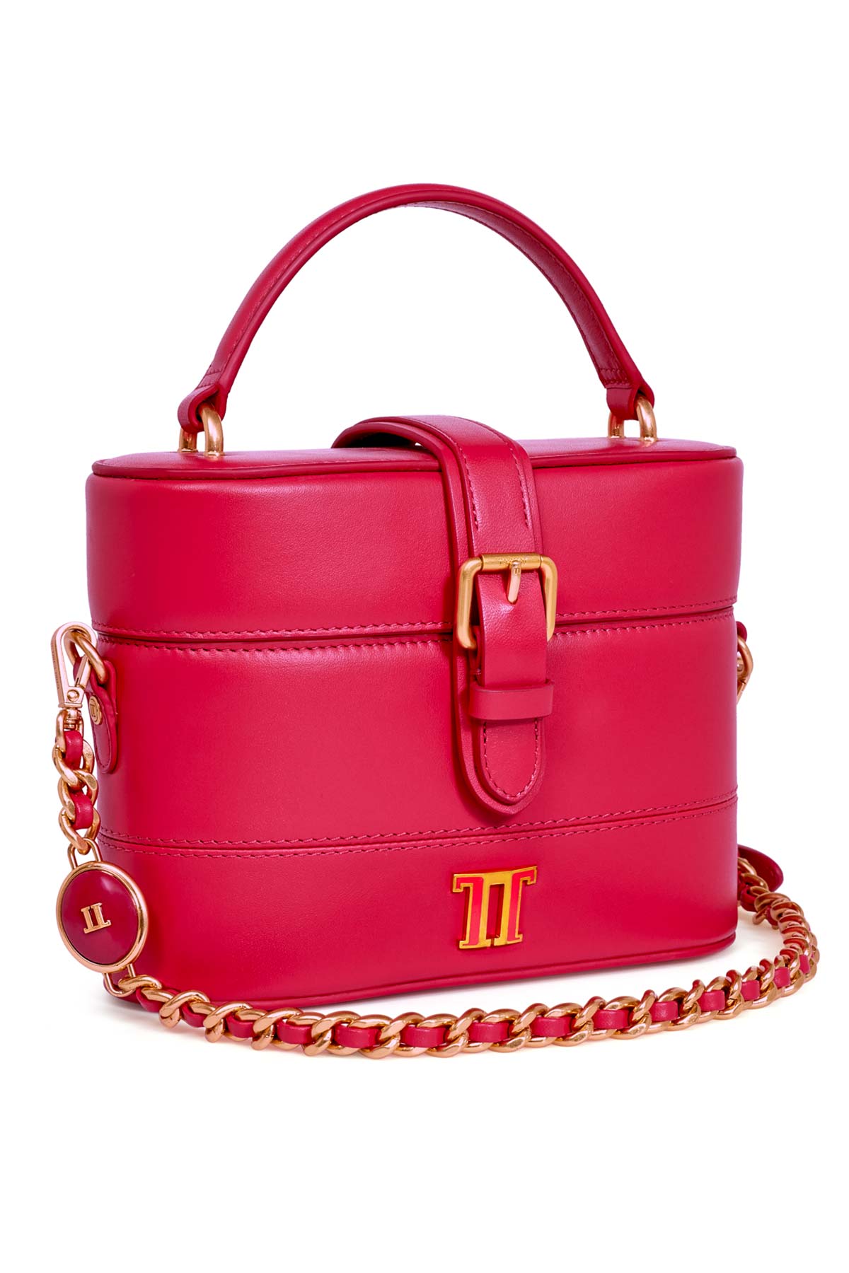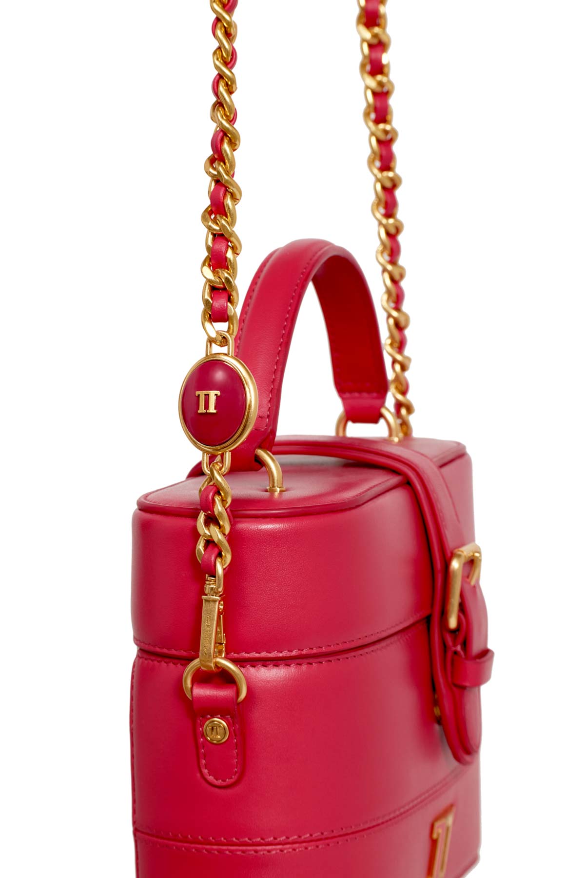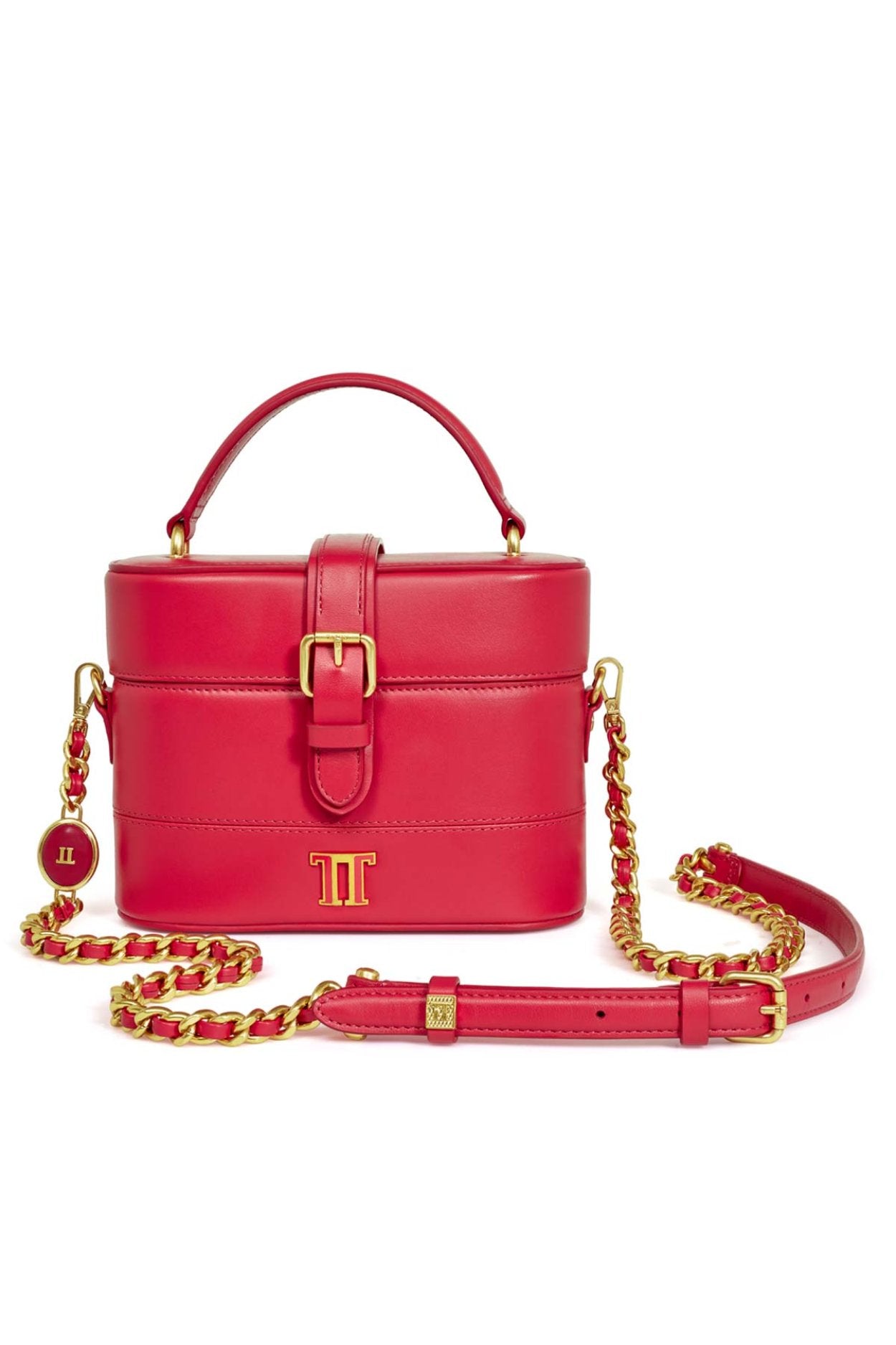 Structured Leather Vanity Bag With A Tt Logo And Charms. The Bag Features A Top Handle And A Chain Strap And A Buckle Lock Detail