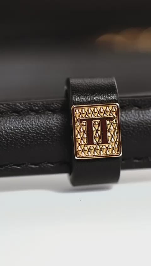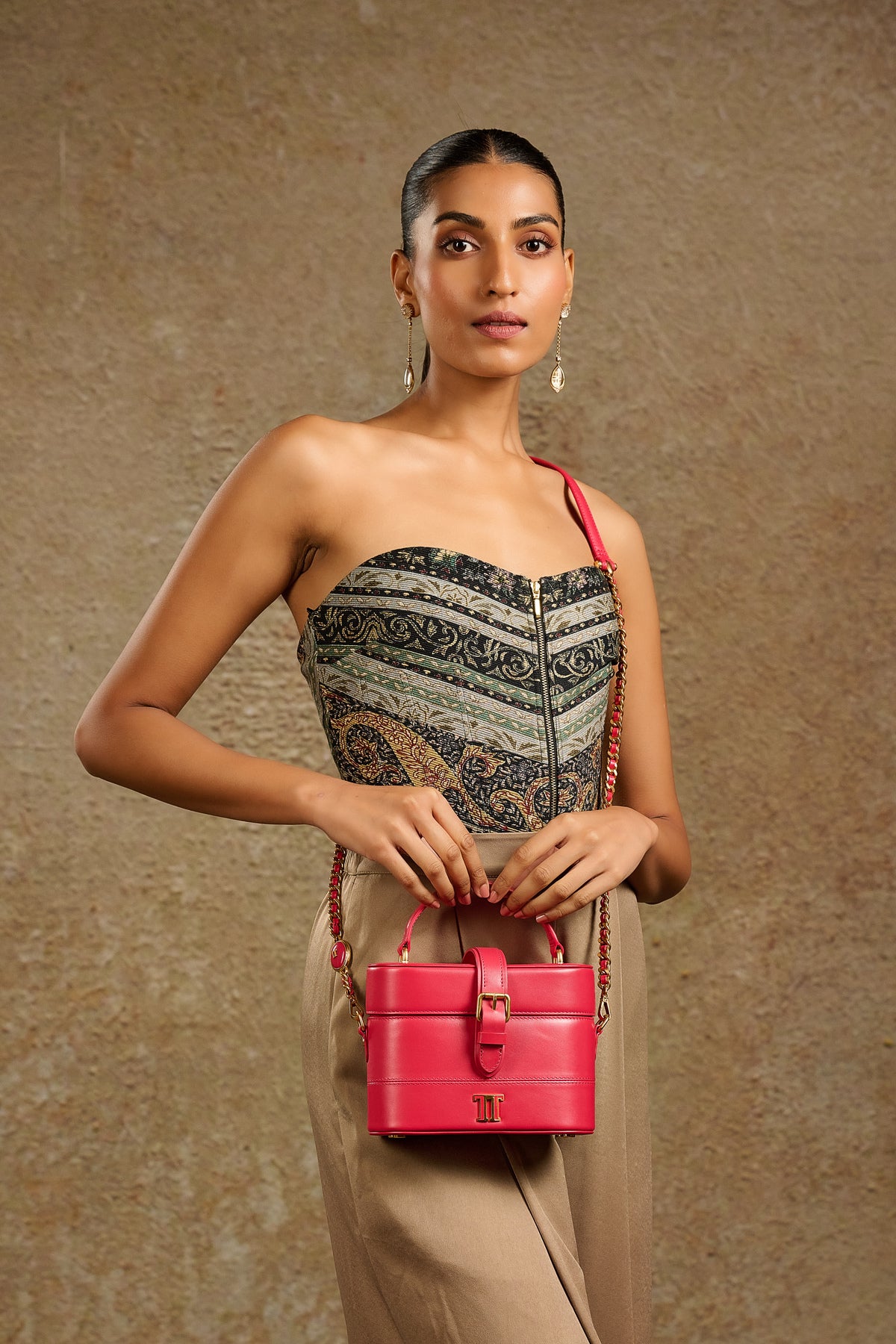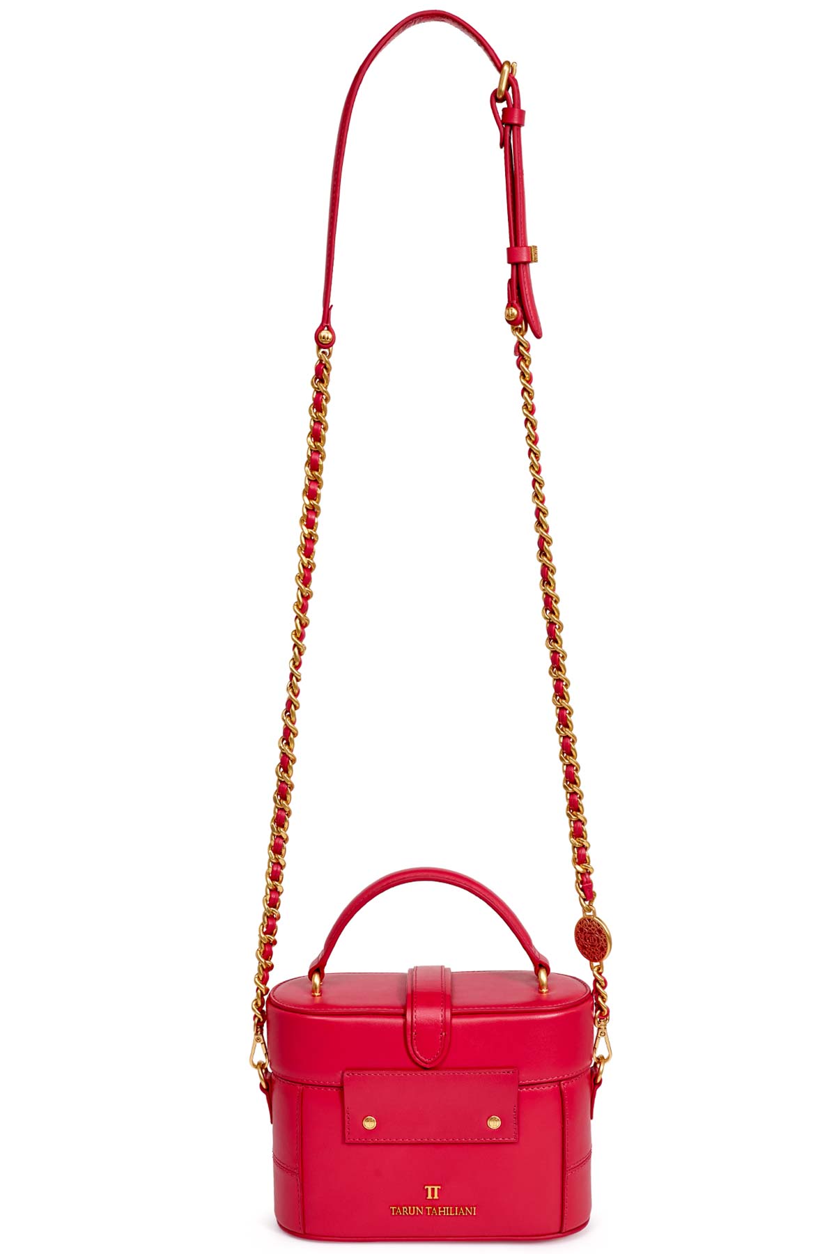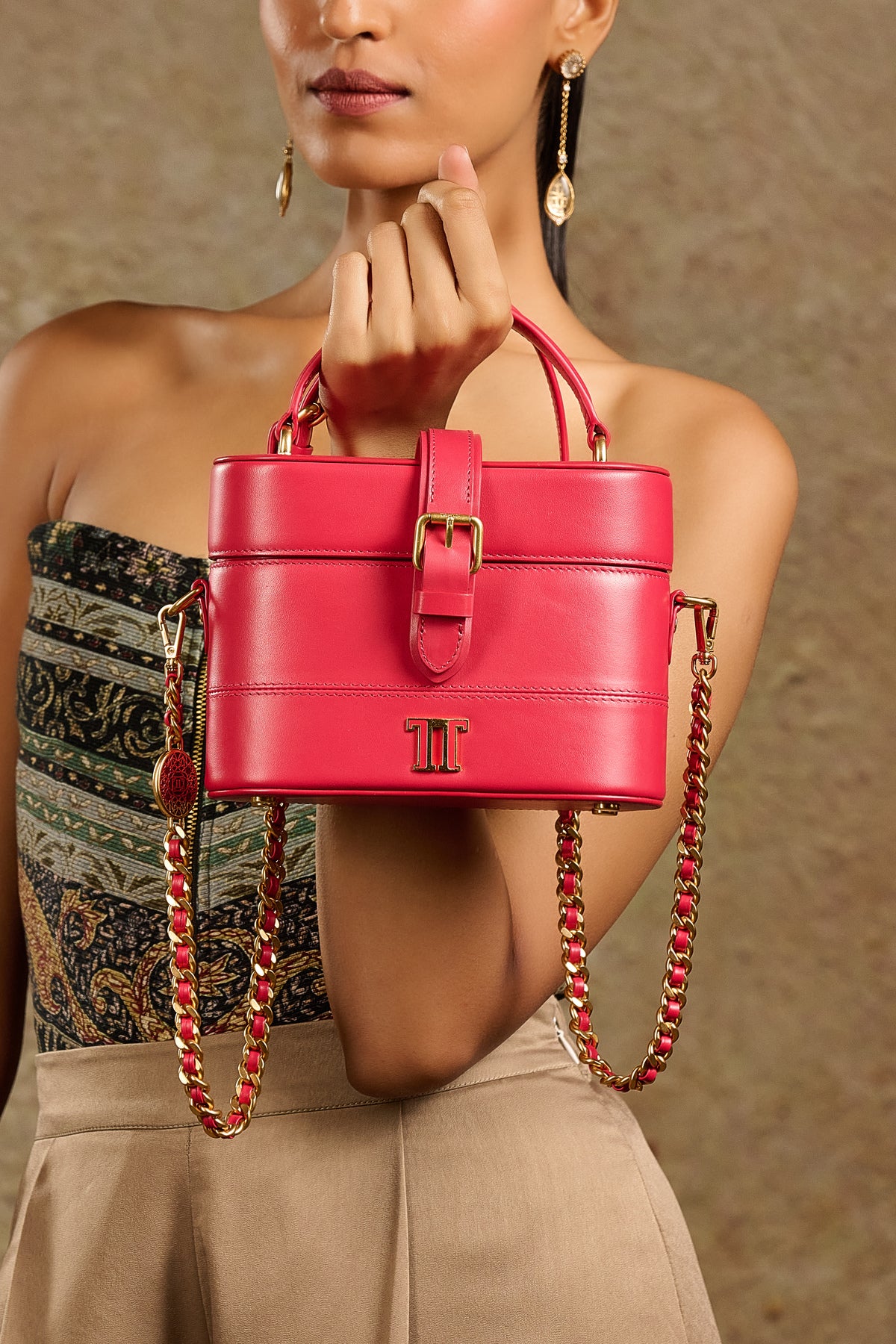Structured Leather Vanity Bag With A Tt Logo And Charms. The Bag Features A Top Handle And A Chain Strap And A Buckle Lock Detail